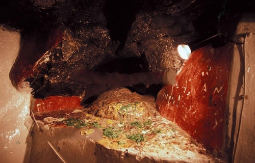 Frente a la entrada de la cueva hay una roca con color roja que representa, según la leyenda, el color de la sangre de Abel mientras en su techo hay una pequeña grieta por donde se filtran gotas de agua que simbolizan las lágrimas de la montaña que aún caen por este crimen.