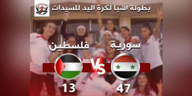 El equipo femenino de Balonmano de Siria venció hoy a su par palestino con 47 a 13 puntos en su cuarto partido del Campeonato Asiático Femenino, que se celebra en la capital jordana hasta el día 25 del mes en curso.