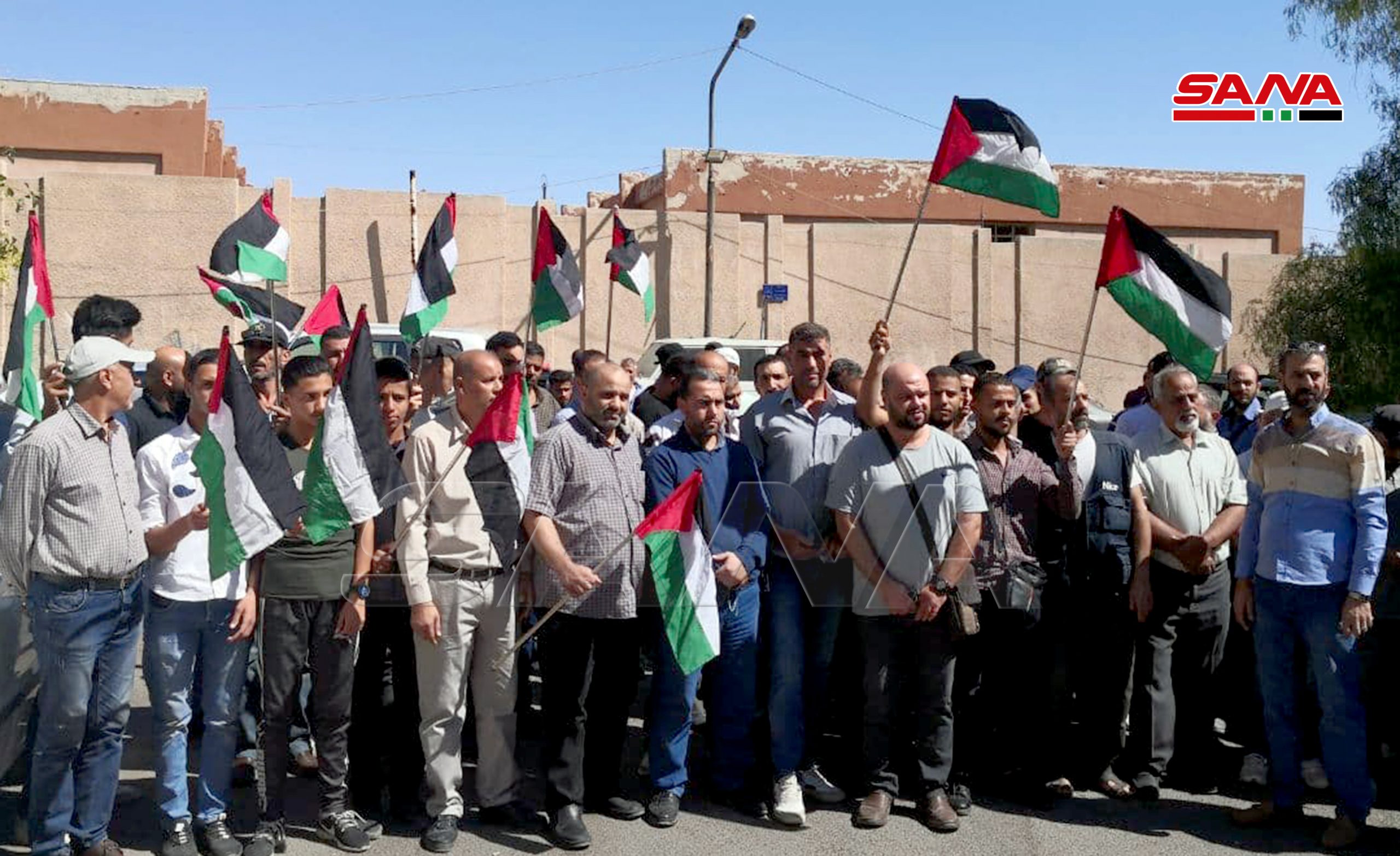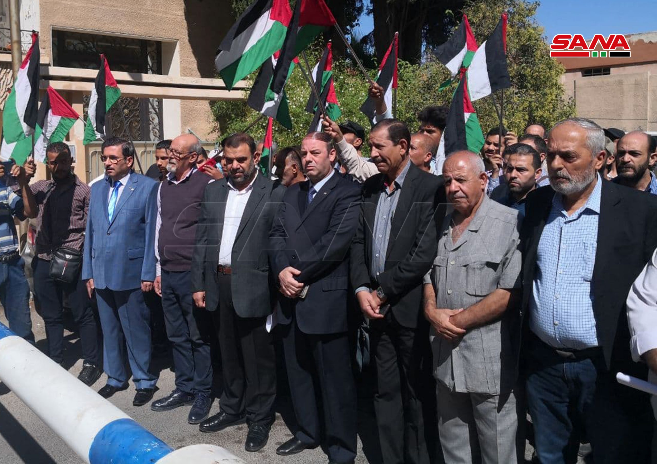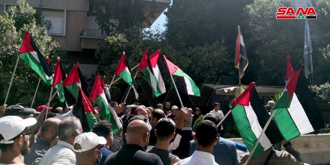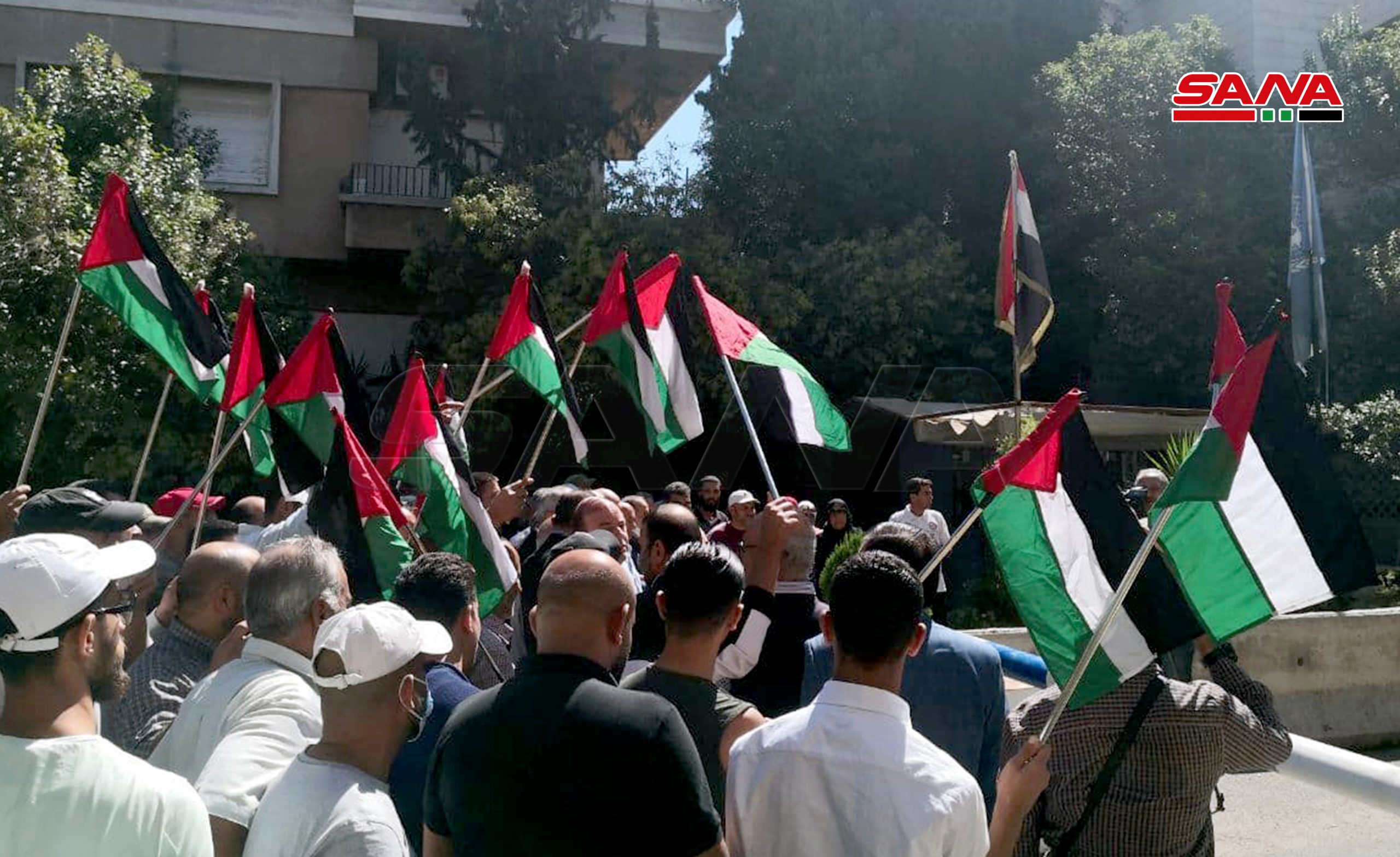 Damasco, 7 oct (SANA) Una protesta tuvo lugar hoy frente a la sede de las Naciones Unidas en Damasco, en rechazo al “acuerdo marco” firmado entre la Agencia de Obras Públicas y Socorro de las Naciones Unidas para los Refugiados de Palestina (UNRWA) y los Estados Unidos.