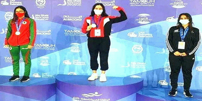 Abu Dabi, 27 oct (SANA)- La nadadora siria, Inana Suleiman, se adjudicó su tercera medalla de oro en el Campeonato Árabe que se desarrolla en la capital de los Emiratos Árabes Unidos, Abu Dabi y cuenta con la participación de 174 nadadores de 16 países árabes.