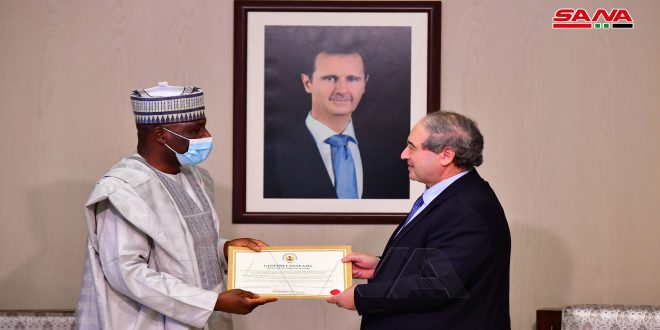 Damasco, 02 nov (SANA) El Ministro de Relaciones Exteriores y Expatriados, Faisal al-Mekdad, recibió hoy las credenciales del Encargado de Negocios de la República Federal de Nigeria en Siria, Ibrahim Yunusa Muhammad.