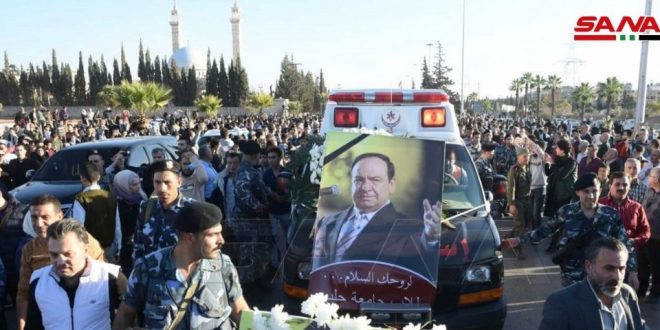 Alepo, 4 nov (SANA) Con la presencia del representante del presidente Bashar al-Assad, el ministro de Asuntos Presidenciales Mansour Azzam, la provincia de Alepo inhumó esta tarde en una procesión solemne, al fallecido gran artista Sabah Fakhri, en medio de una gran participación oficial y popular.