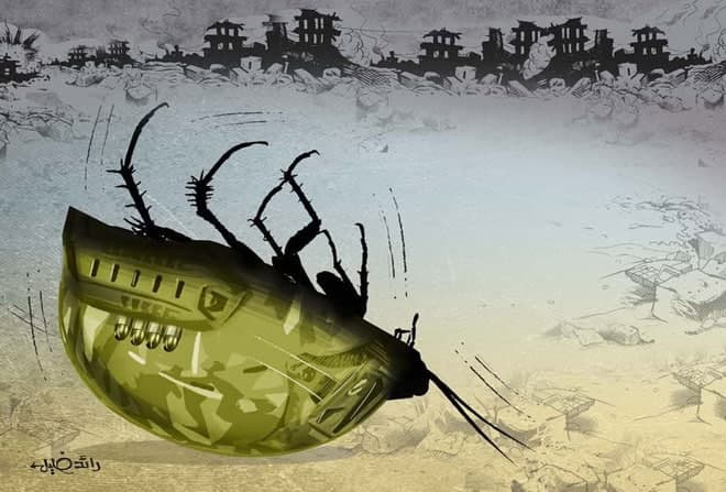 La obra ganadora en Corea retrata de manera elocuente y burlona la realidad de las guerras y la arrogancia estadounidense y su papel subversivo en todos los países del mundo. Pues, la caricatura de Khalil refleja un casco estadounidense se identifica con el caso de la “cucaracha” que muere de espaldas debido al fallo total de su sistema nervioso.