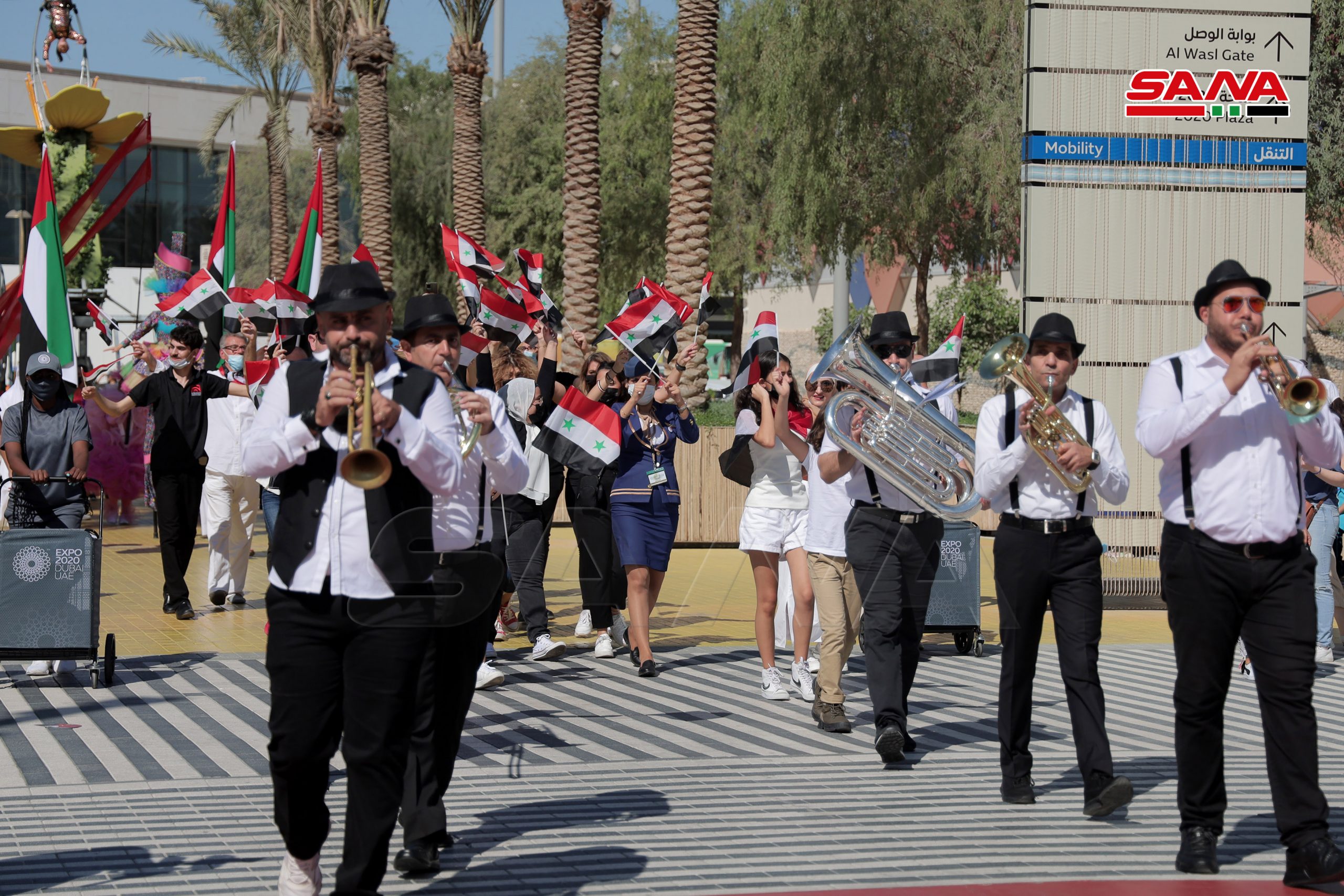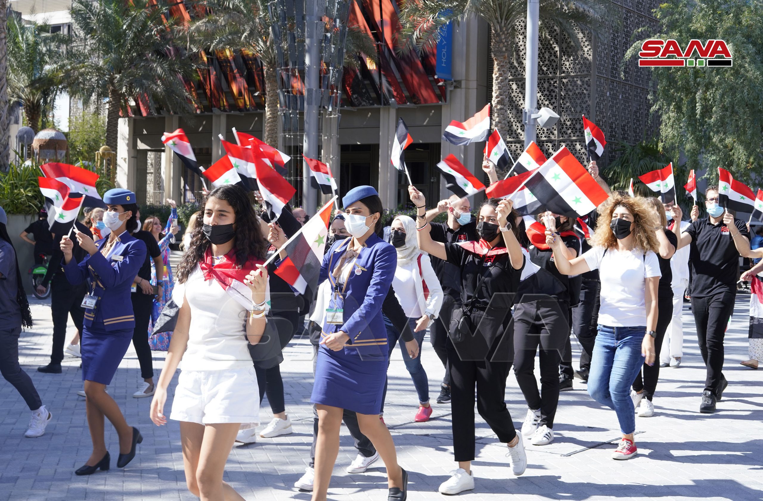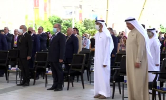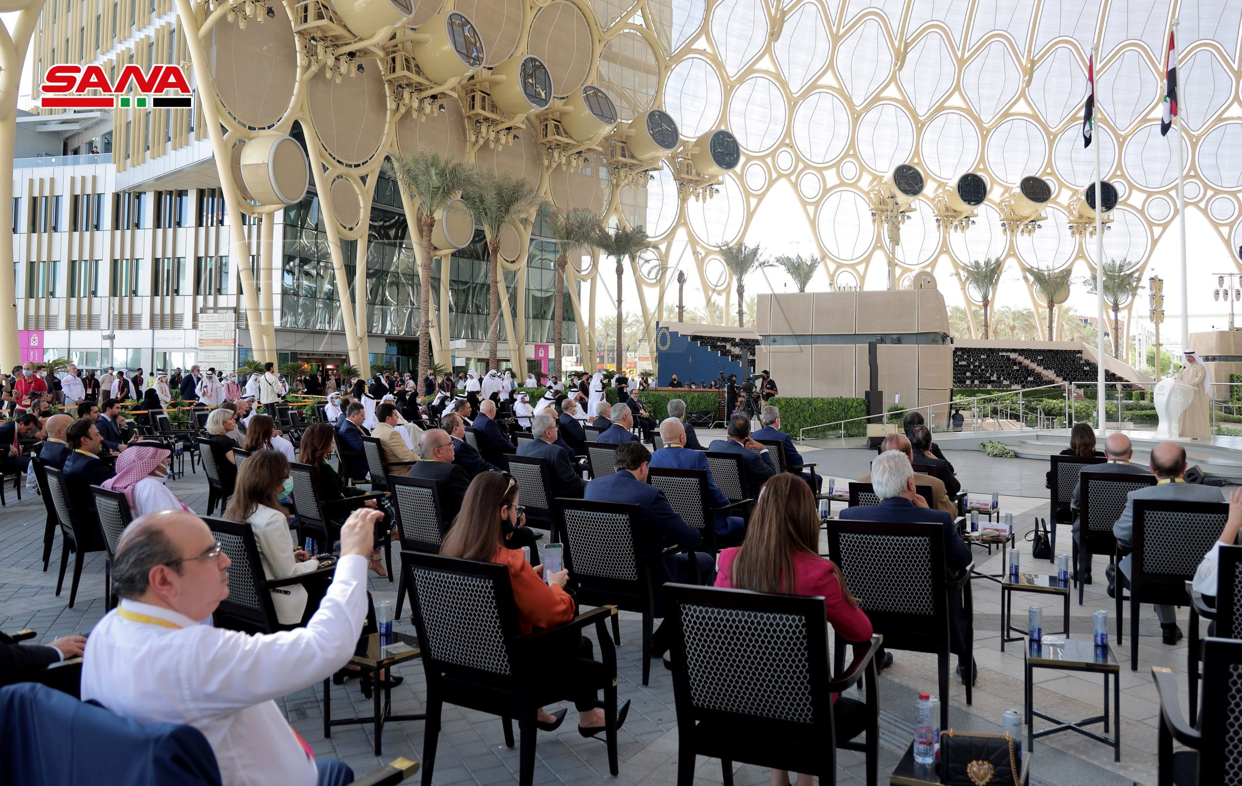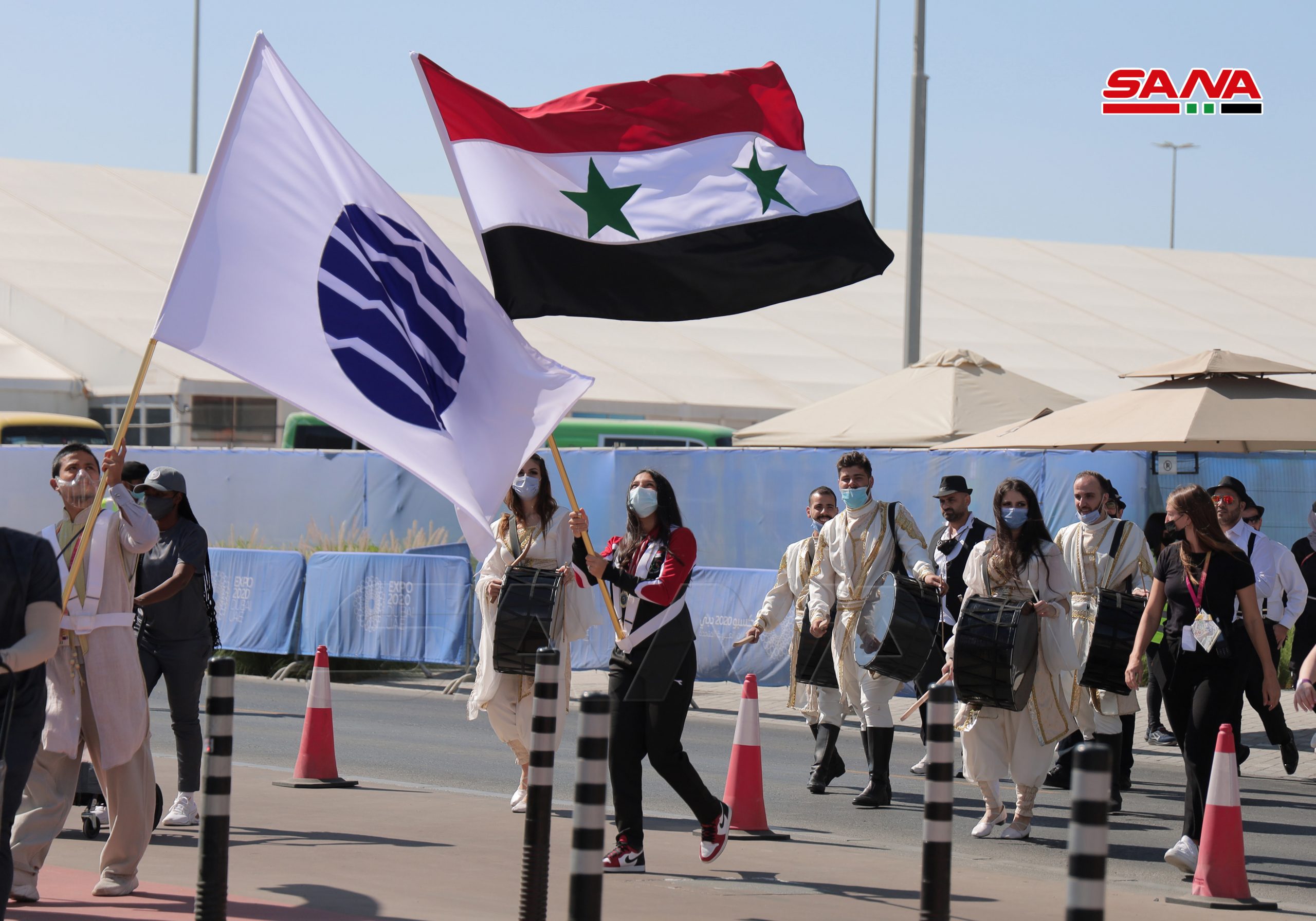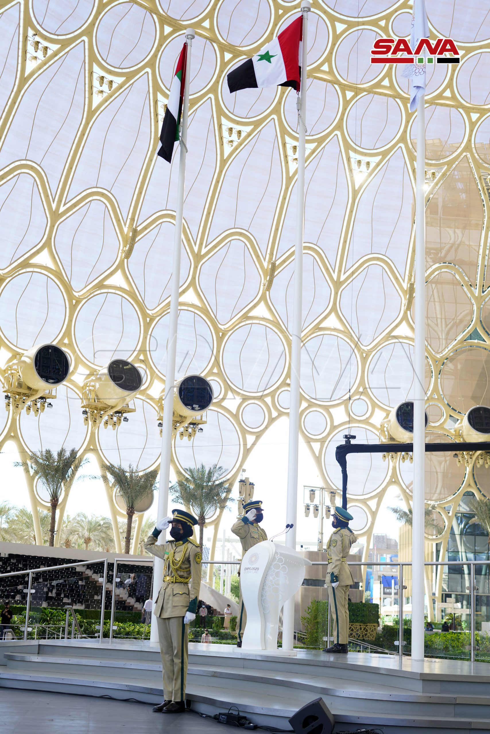 La ceremonia de inauguración oficial del Día Nacional de Siria comenzó en la plaza Al-Wasl con la interpretación del himno árabe sirio, el izamiento de la bandera nacional y una actuación de danza siria.