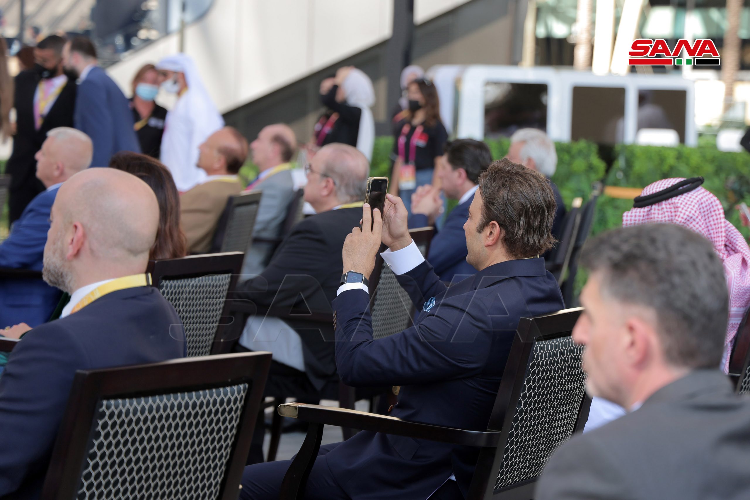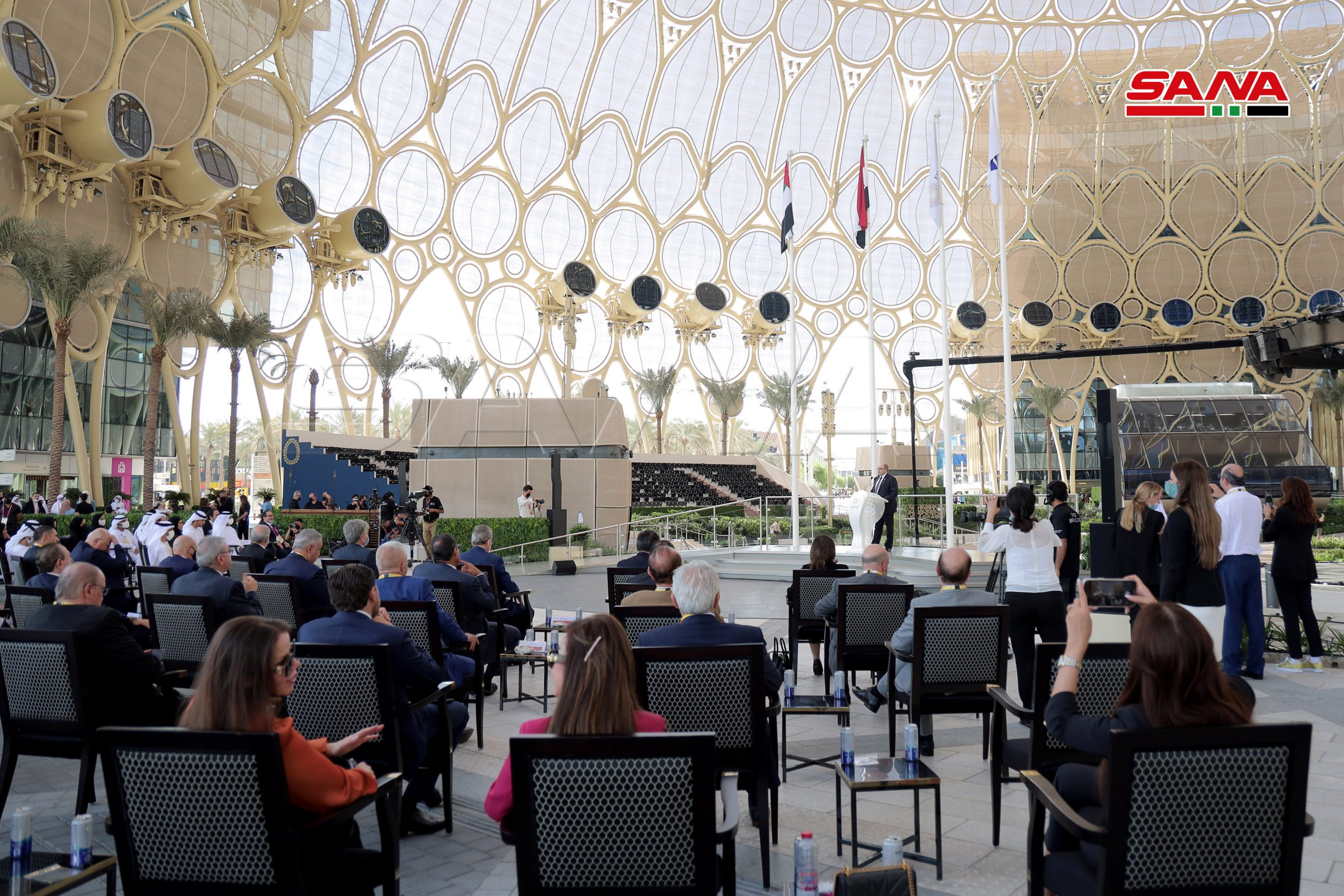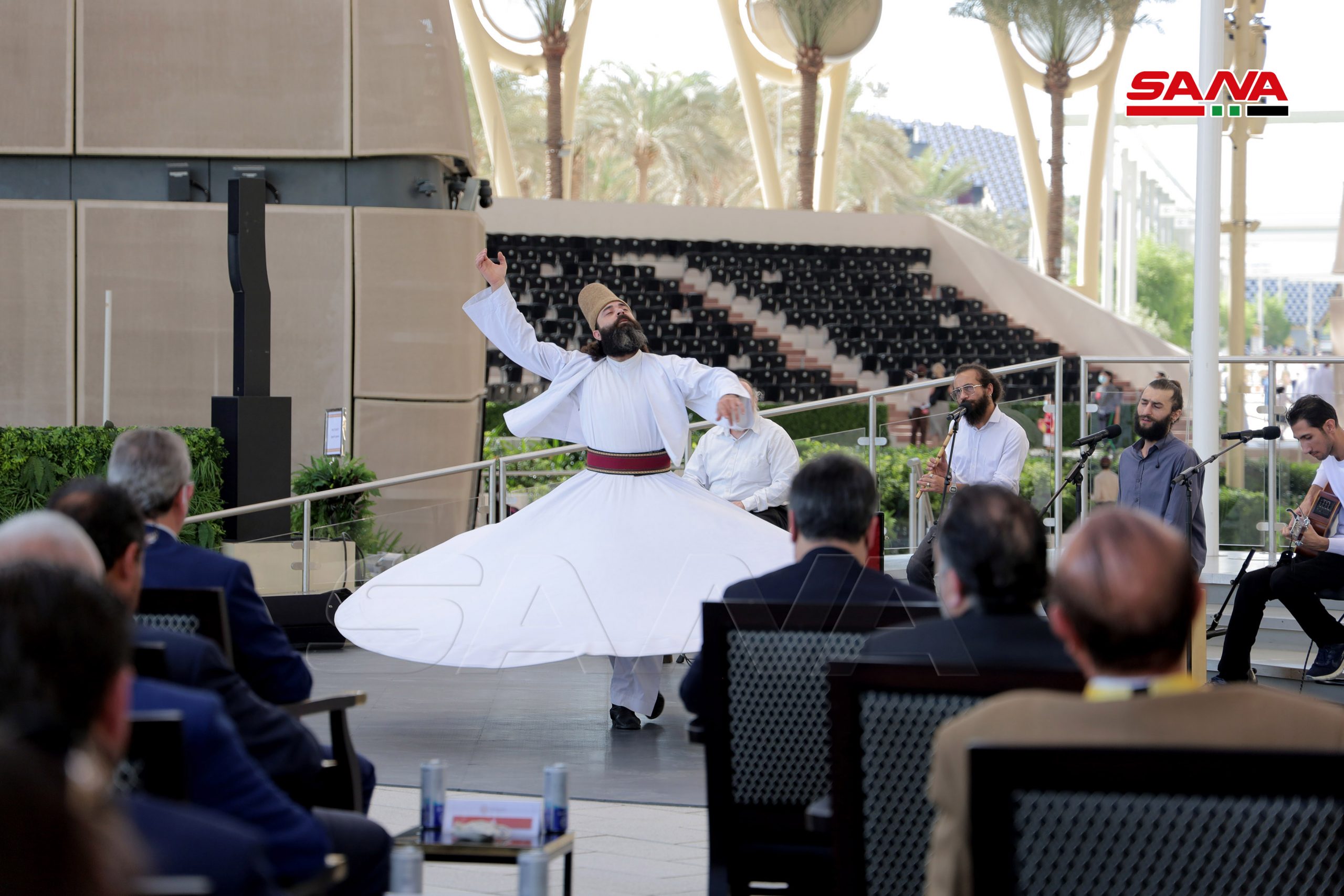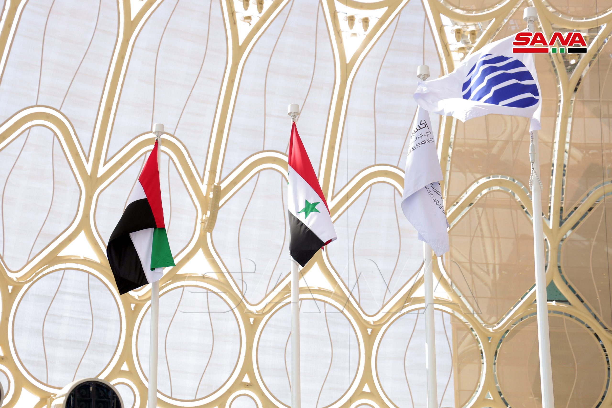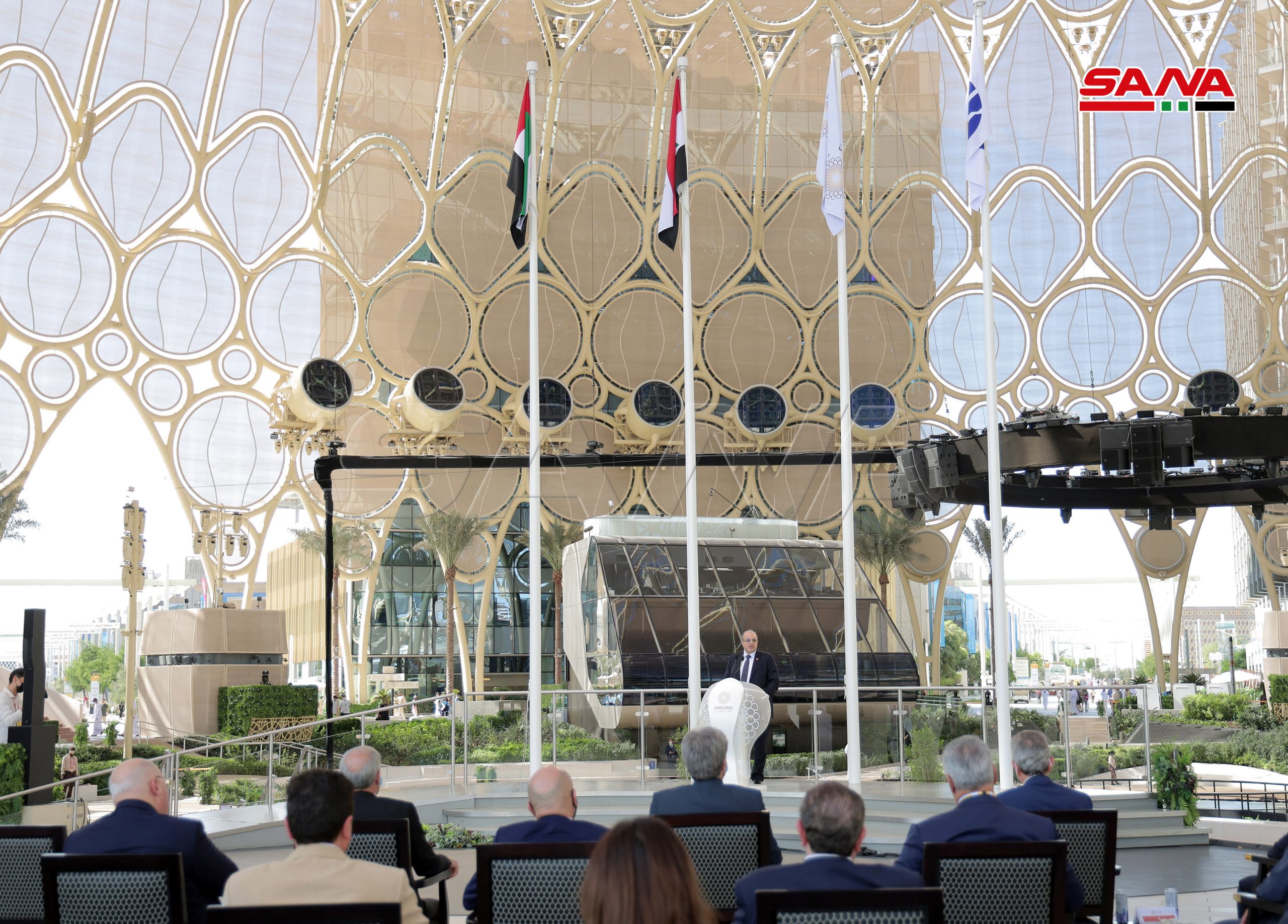 La ceremonia de inauguración oficial del Día Nacional de Siria comenzó en la plaza Al-Wasl con la interpretación del himno árabe sirio, el izamiento de la bandera nacional y una actuación de danza siria.