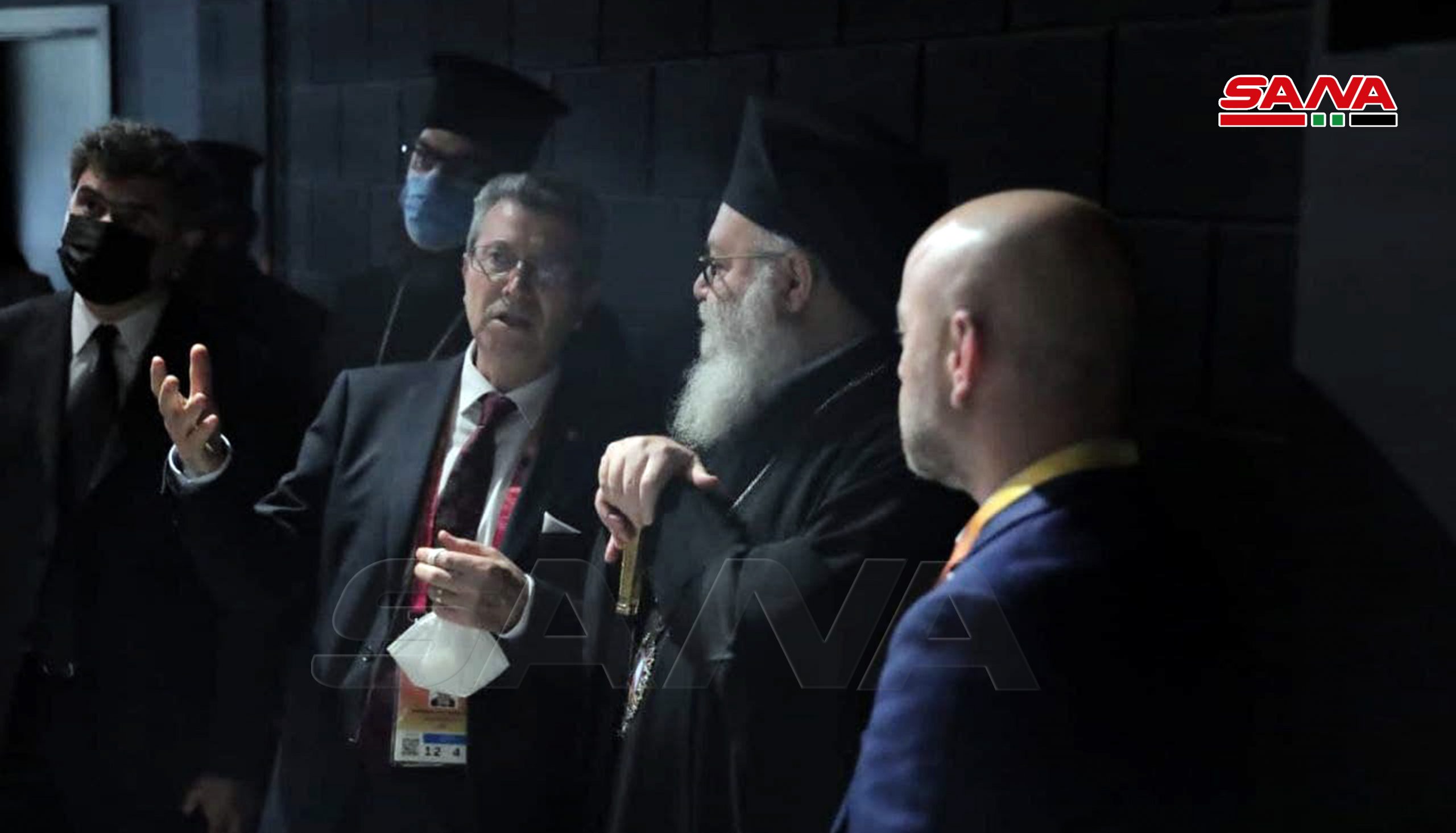 El patriarca Yazaji y los miembros de la delegación recorrieron las secciones del pabellón donde contemplaron los objetos exhibidos, entre ellos figura una réplica del alfabeto de Ugarit, y un segmento audiovisual de la “Canción de Nikal” considerada la nota musical más antigua del mundo.