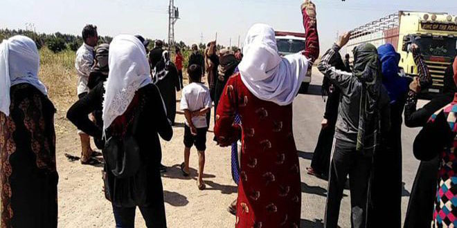 Hasakeh, 28 nov (SANA) Decenas de personas de las ciudades de Qamishli y Amuda en el nordeste de la provincia de Hasakeh, protestaron frente al edificio de la UNICEF en Qamishli para denunciar a la milicia Fuerzas Democráticas de Siria (FDS) que recluta a niñas menores de edad en sus filas.