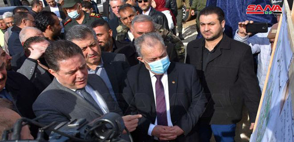 Al comienzo del recorrido, el jefe del Gabinete colocó la piedra angular para el proyecto del complejo residencial al-Amal que será construido sobre un área de 104 hectáreas y consta de cientos de unidades de vivienda con un costo de 7.6 mil millones de libras sirias.