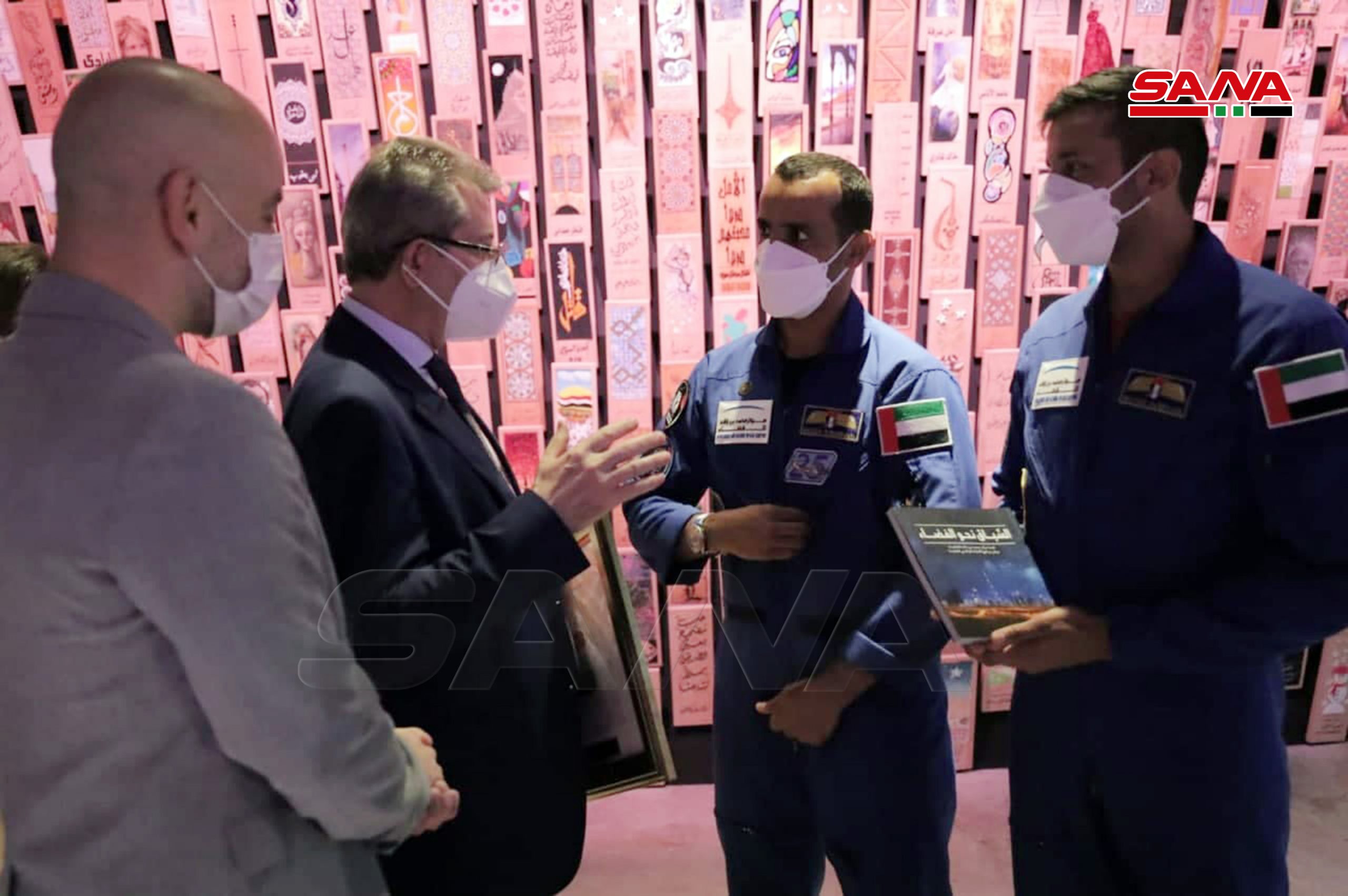 Durante la visita, el astronauta Al-Mansouri entregó al embajador Abbas la bandera de Siria, que llevó con él durante su viaje al espacio, expresando su placer de visitar el pabellón de Siria.