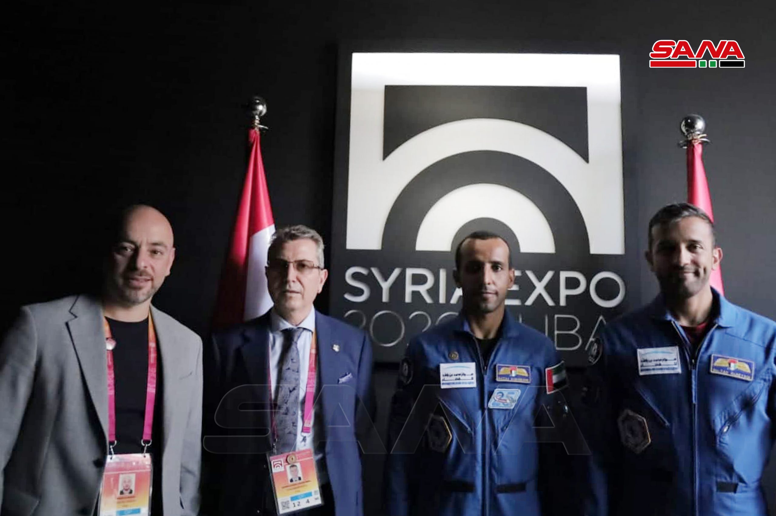 El embajador sirio en los EAU, Ghassan Abbas, y el director del pabellón, Khaled al-Shamaa, recibieron a los astronautas emiratíes Hazza al-Mansouri y Sultan al-Neyadi, acompañados por una delegación del Centro Mohammed bin Rashid de Investigaciones Espaciales.