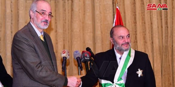 Durante la ceremonia, el viceministro de Exteriores y Expatriados, Bashar al-Jaafari, otorgó al Embajador Zakhia la Orden al Mérito Sirio de la Clase Excelente, en reconocimiento por sus buenos esfuerzos en el fortalecimiento de las relaciones entre los dos países hermanos.