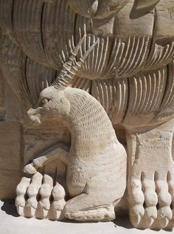 La pata izquierda del león tiene una inscripción en dialecto palmirense que dice “Al-lat bendecirá a quien no arroje sangre en el santuario”.