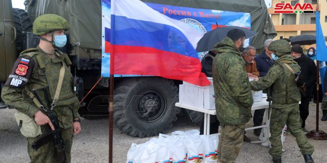 El representante del Centro de Coordinación Ruso, Alexander Sasha, dijo al reportero de SANA que la Federación Rusa continúa brindando ayuda en varias regiones de Siria, afirmando que se han distribuido cerca de 500 paquetes para las familias de los mártires y las familias necesitadas en la aldea.