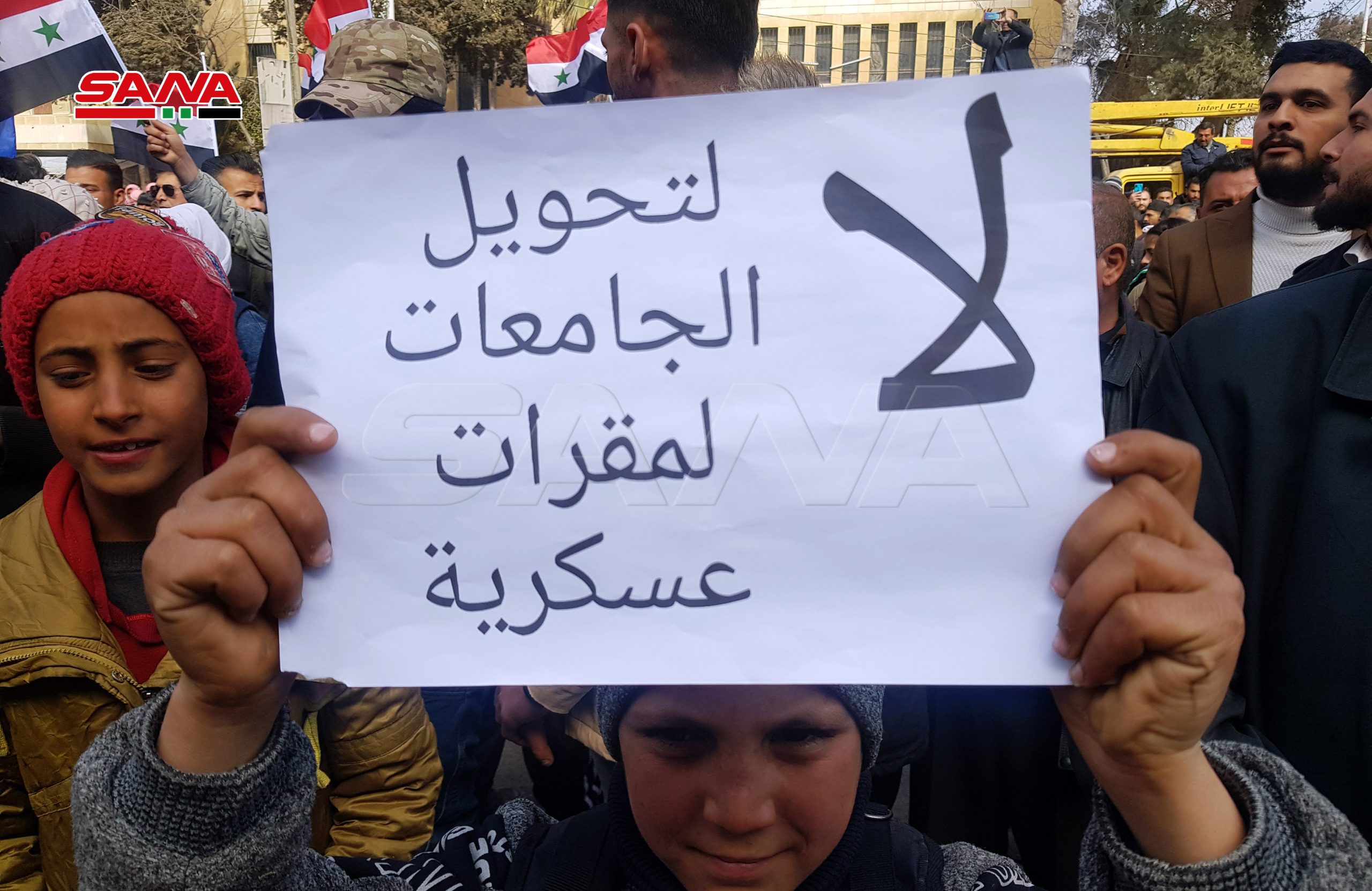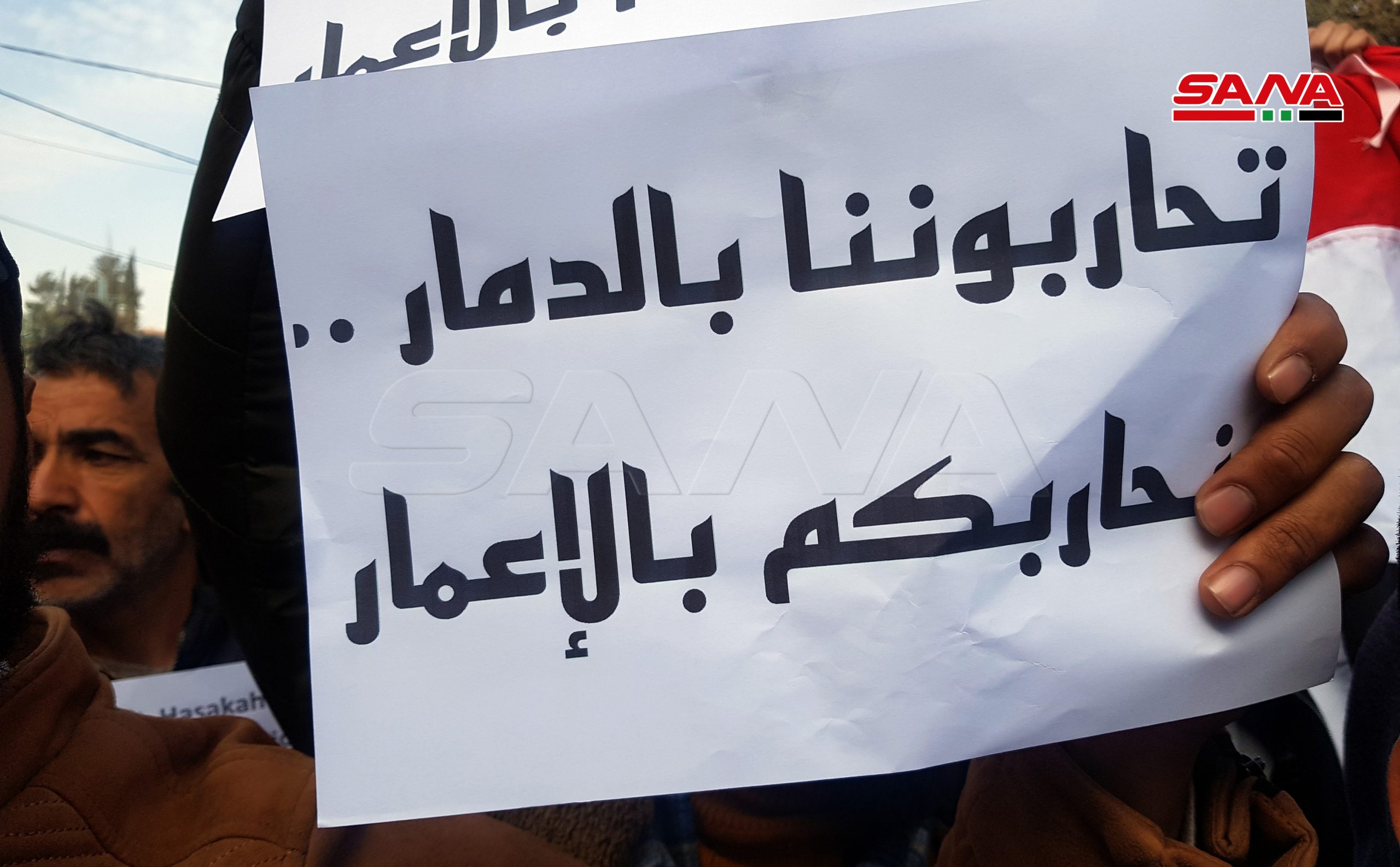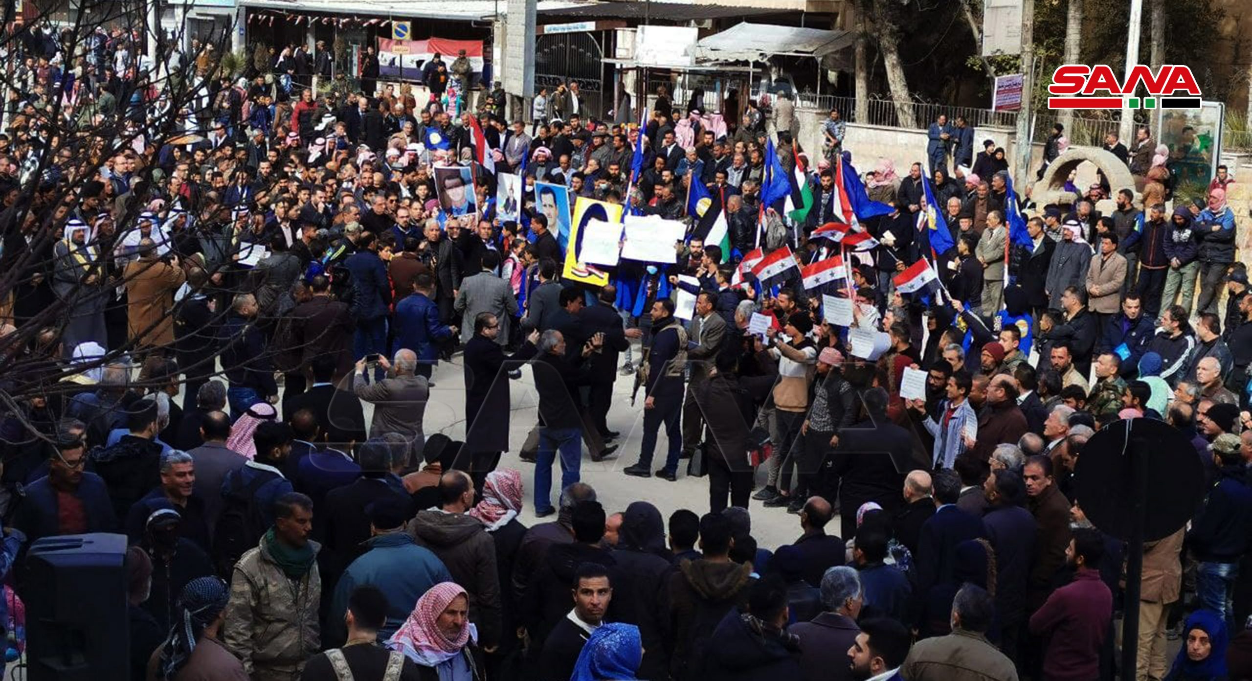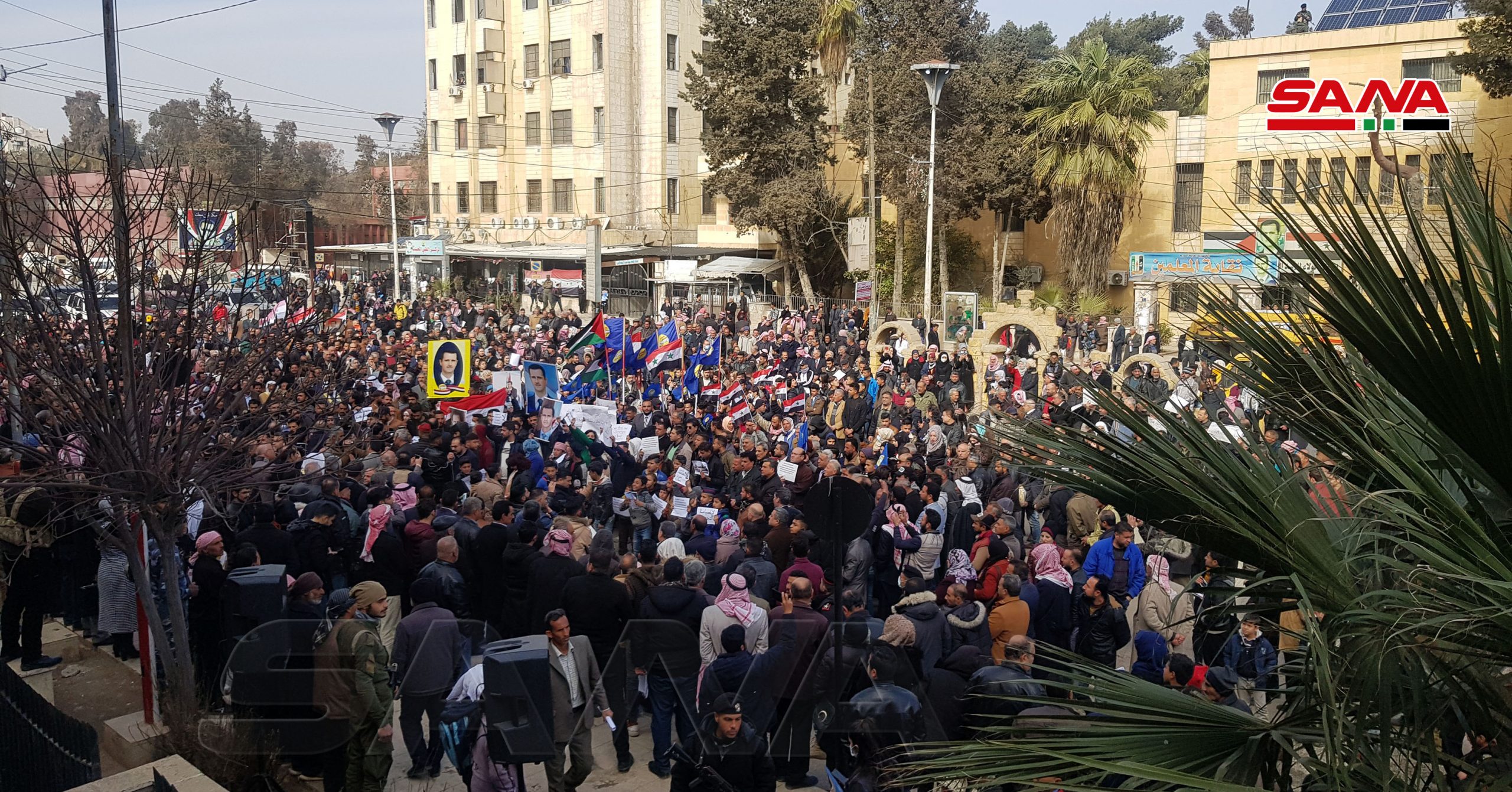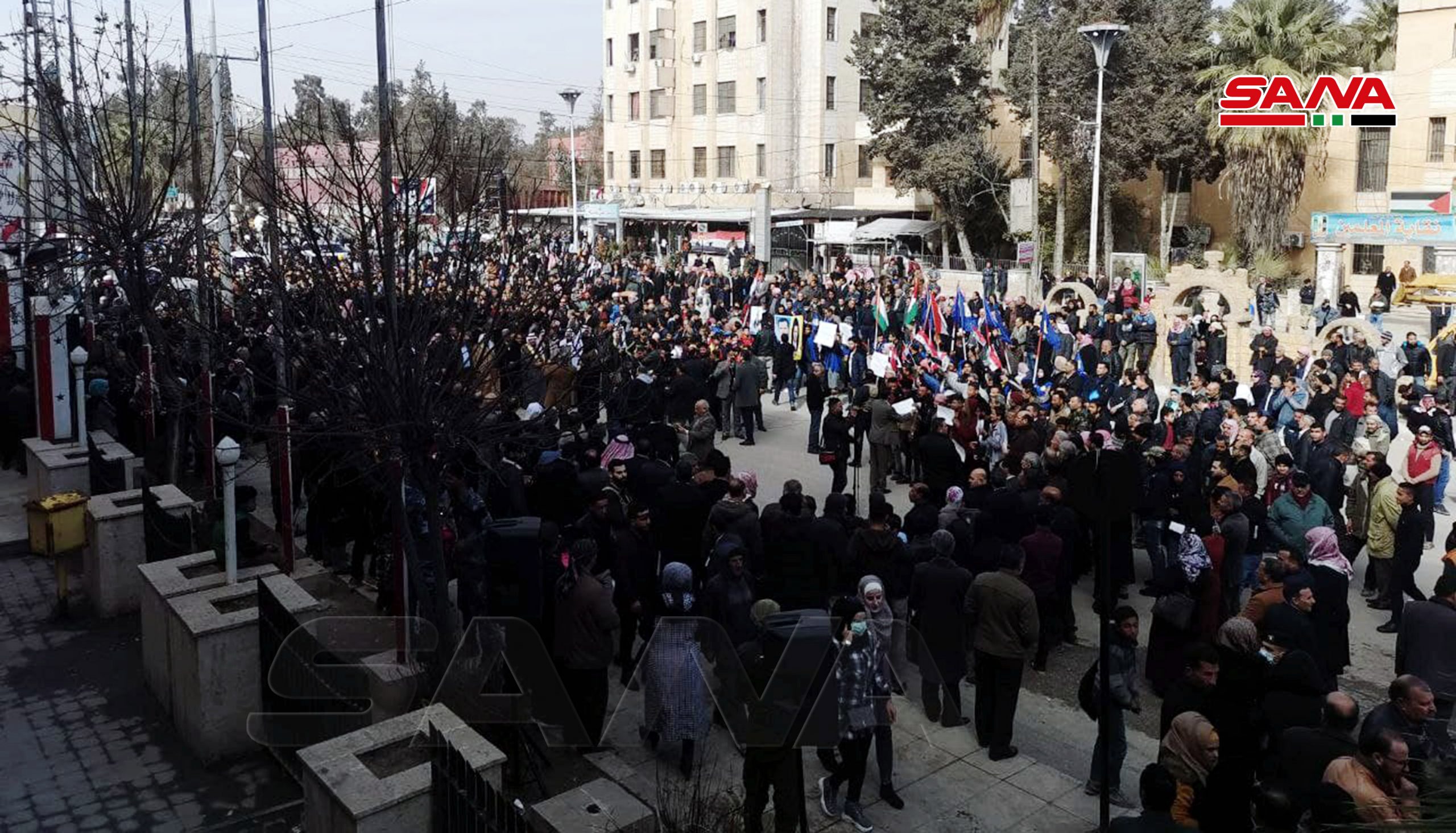 Damasco, 09 feb (SANA) Una protesta popular tuvo lugar hoy en la Plaza del Presidente de la ciudad de Hasakeh, capital de la provincia nororiental del mismo nombre, en rechazo a la destrucción de las facultades de Economía y de Ingeniería Civil y del Instituto Politécnico por parte de las fuerzas de ocupación estadounidense.