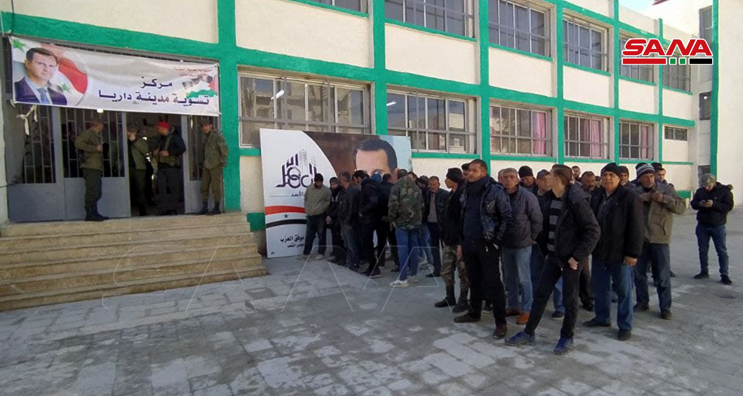 Raqa – Damasco-campo, 12 feb (SANA) Decenas de civiles prófugos y militares fugitivos acuden al centro de reconciliación abierto por las autoridades competentes el pasado jueves en la ciudad de Dareya, al suroeste de Damasco.