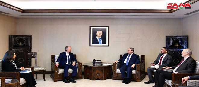 Damasco, 16 feb (SANA) El ministro de Exteriores y Expatriados, Faisal al-Mekdad, se reunió hoy con el Enviado Especial de la ONU para Siria, Geir Pedersen, y la delegación que le acompaña.