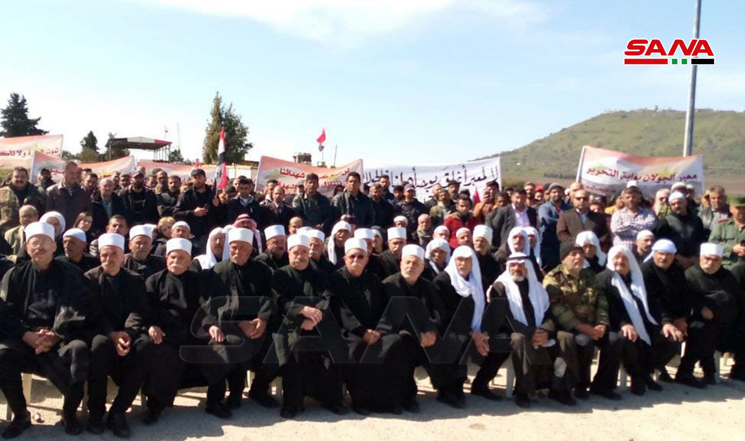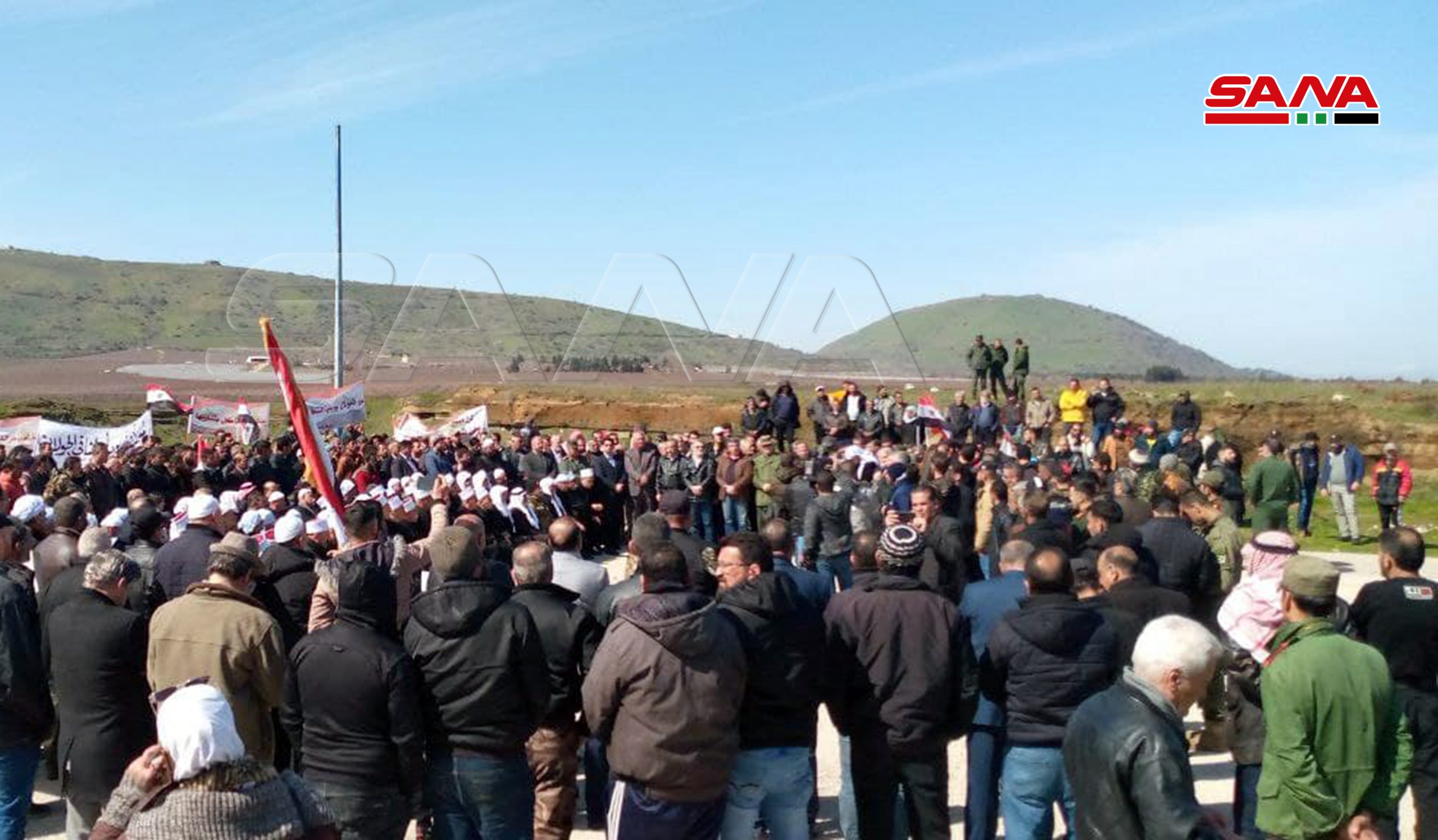 Quneitra, 28 feb (SANA) Los pobladores de la provincia de Quneitra se concentraron este lunes en el cruce de la ciudad liberada para protestar contra las acciones provocativas israelíes de intervención en los asuntos internos del Estado sirio.