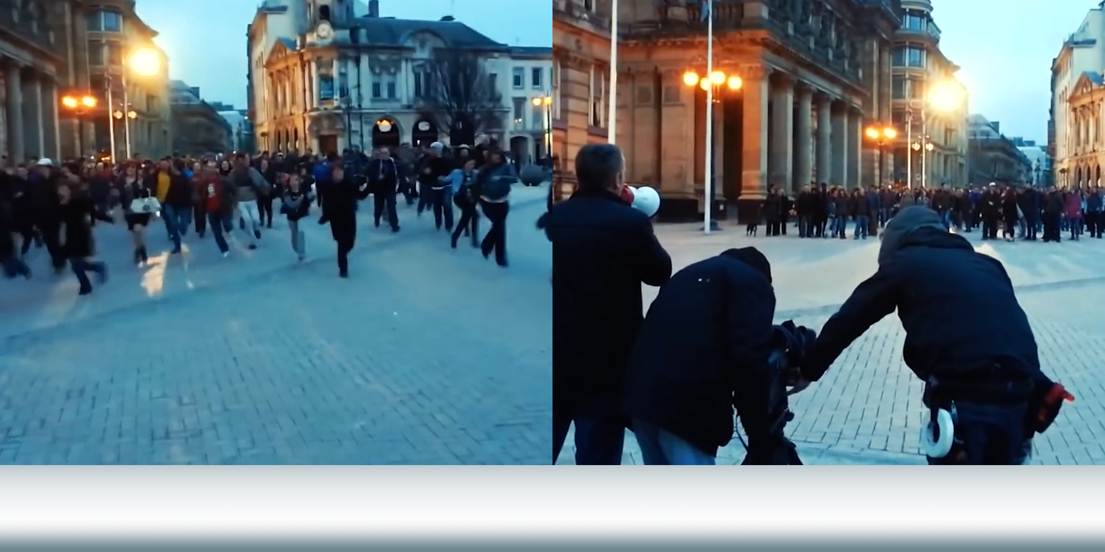 Esta imagen se trata de una escena de una película filmada en Kiev y muestra un estado de histeria entre los ciudadanos al oír las sirenas