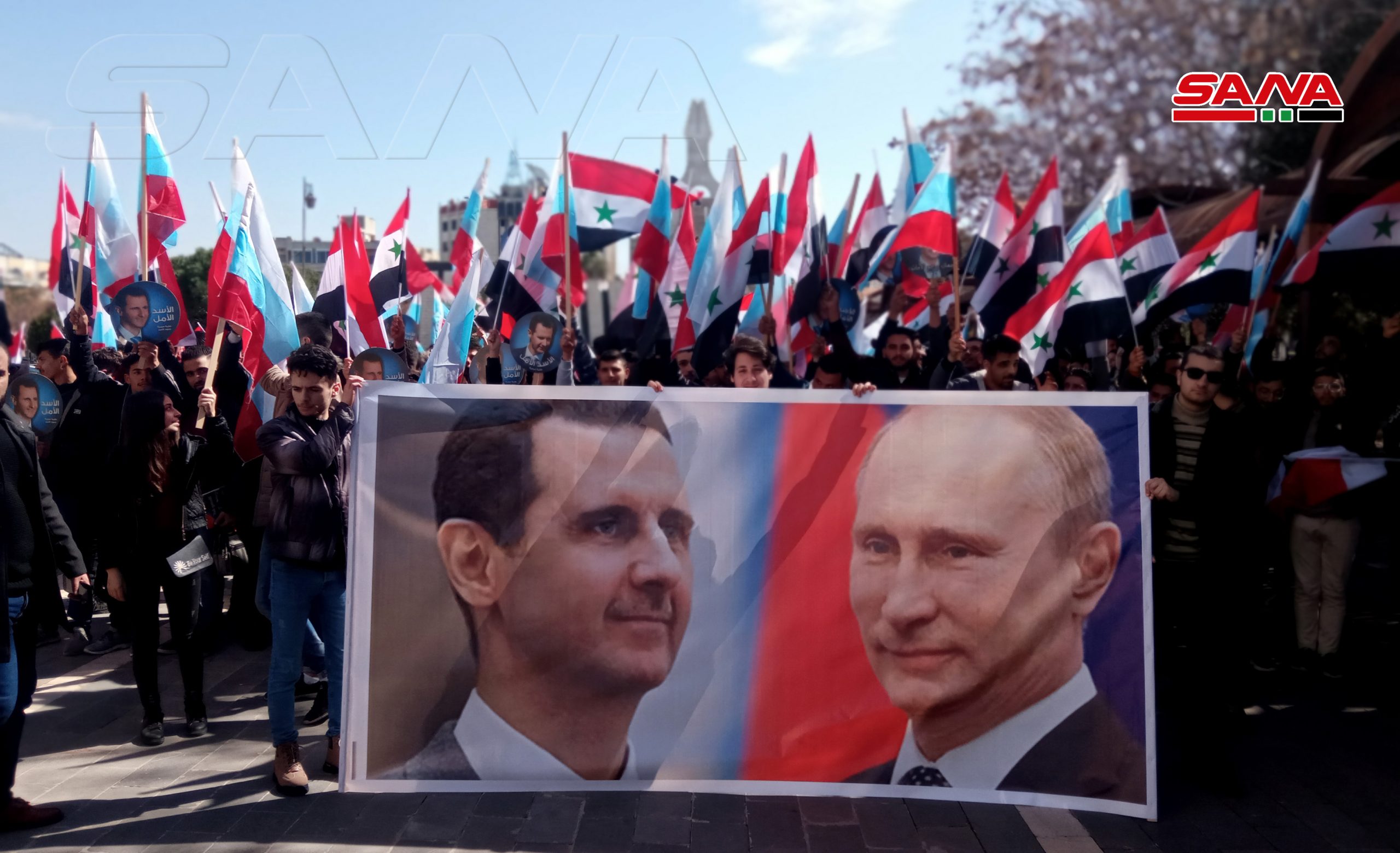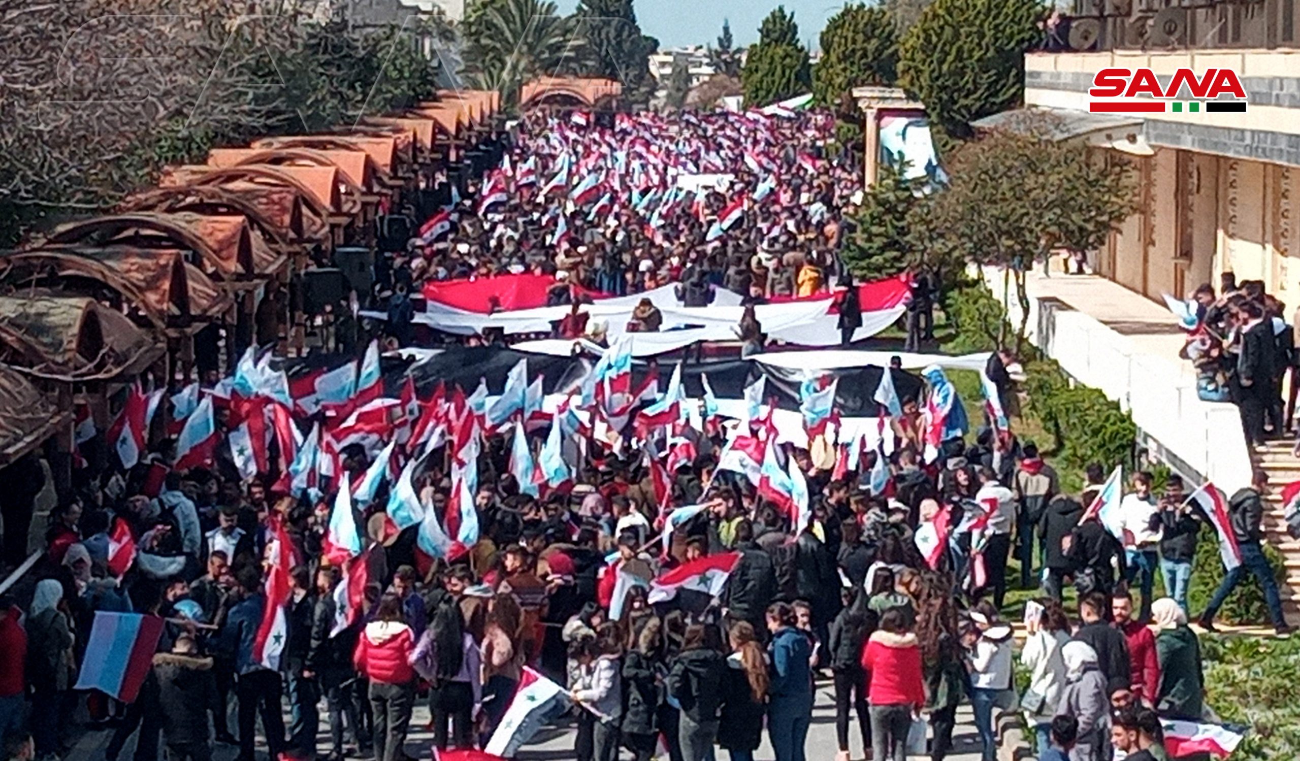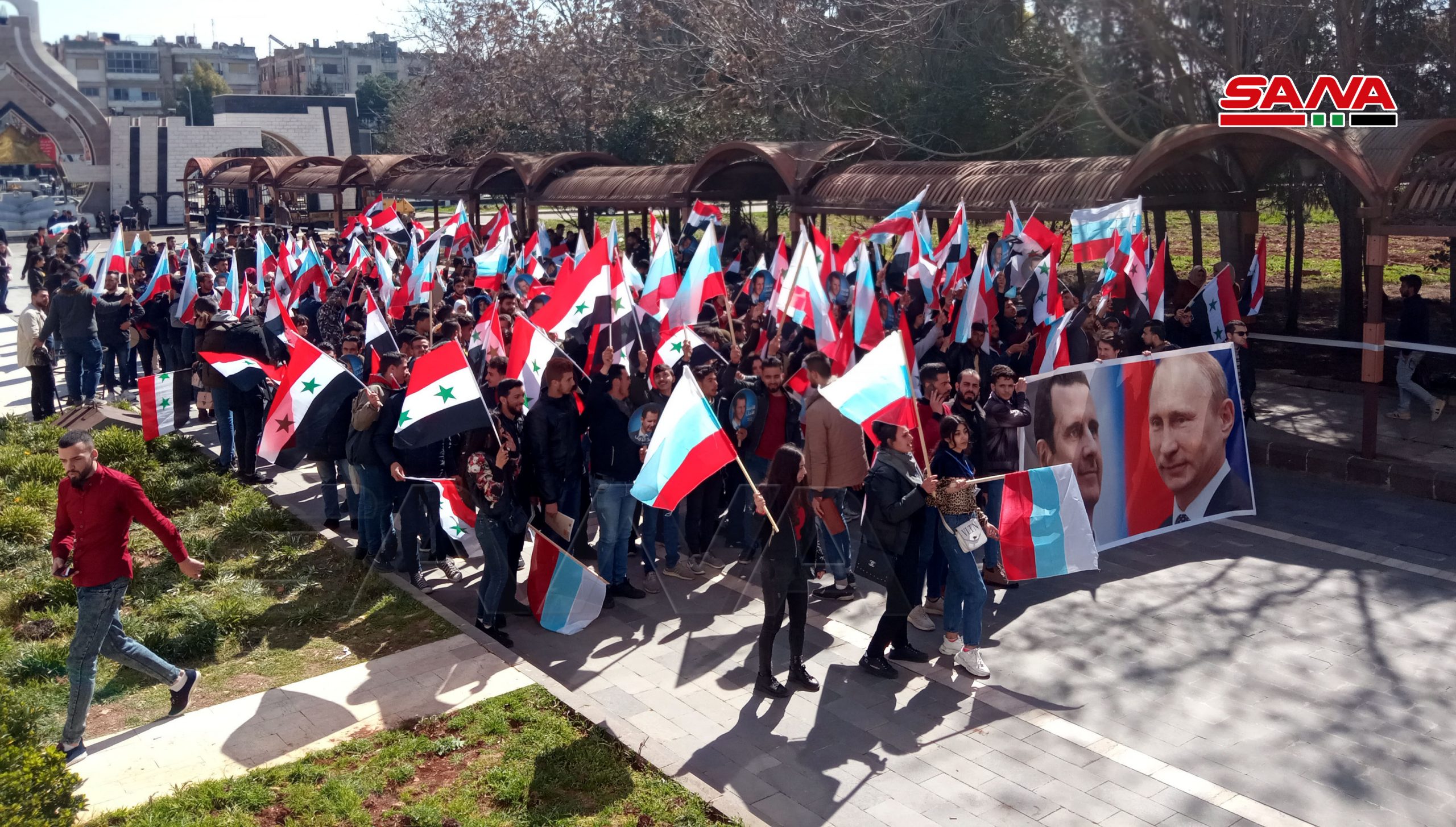 Homs, 8 mar (SANA) Miles de estudiantes y miembros del personal docente se concentraron hoy en la Universidad de Baath en la ciudad central siria de Homs para manifestar su apoyo y solidaridad con Rusia.