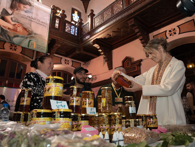 La Sra. Asmaa recorrió las distintas secciones de la feria y habló con las mujeres productoras sobre sus pequeños proyectos, las vías de desarrollar sus productos, y los métodos que utilizan para comercializarlos, además de los obstáculos que impide en su trabajo.