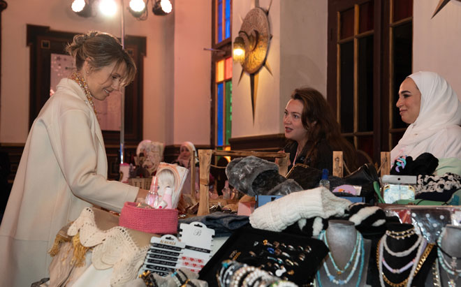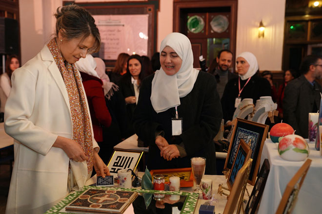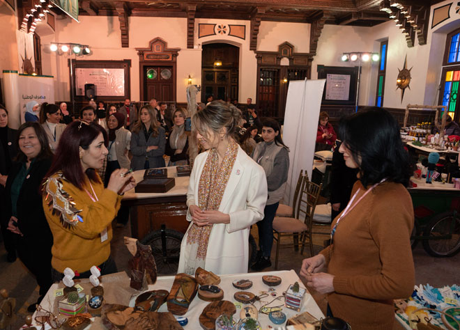 Damasco, 08 mar (SANA) Con motivo del Día Internacional de la Mujer, la primera dama, Asmaa al-Assad, visitó hoy el mercado de “Productoras Sirias”, que acoge la histórica sede de la estación de ferrocarriles Hijaz en el centro de Damasco.