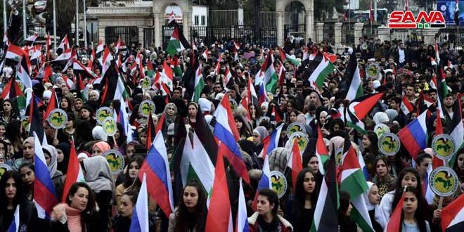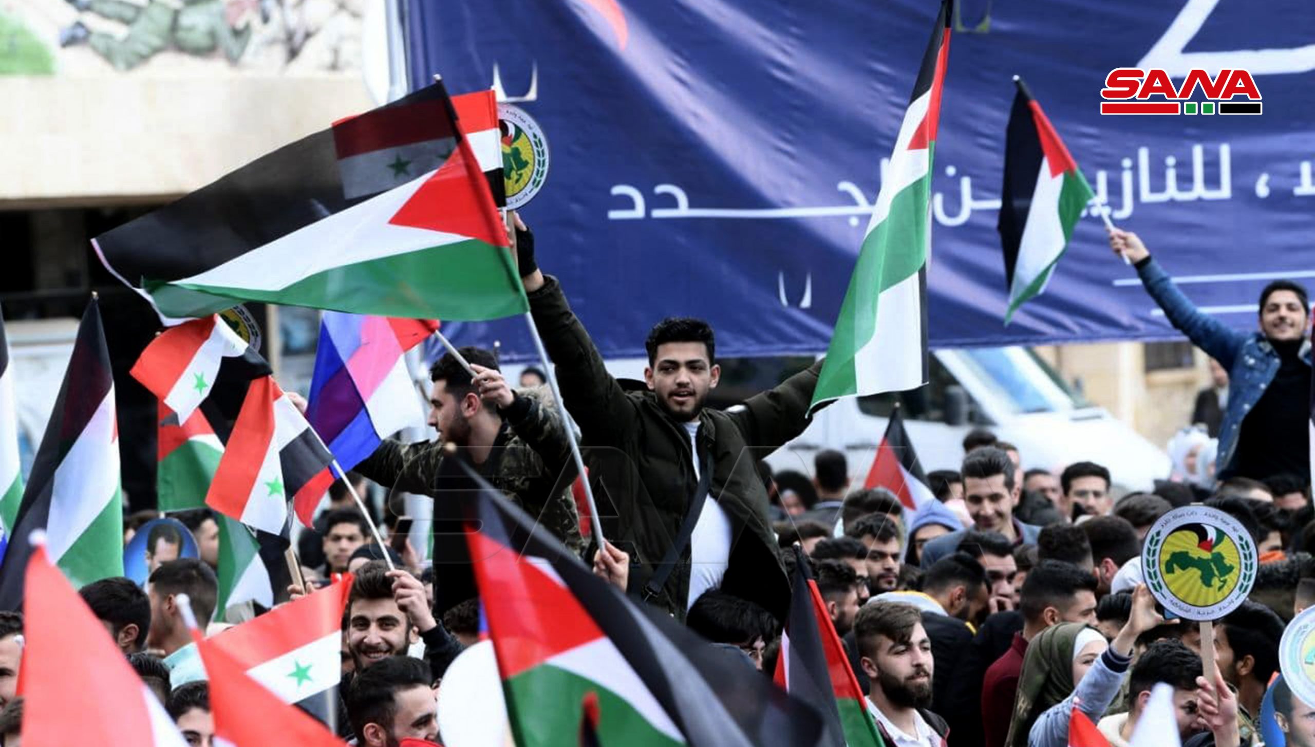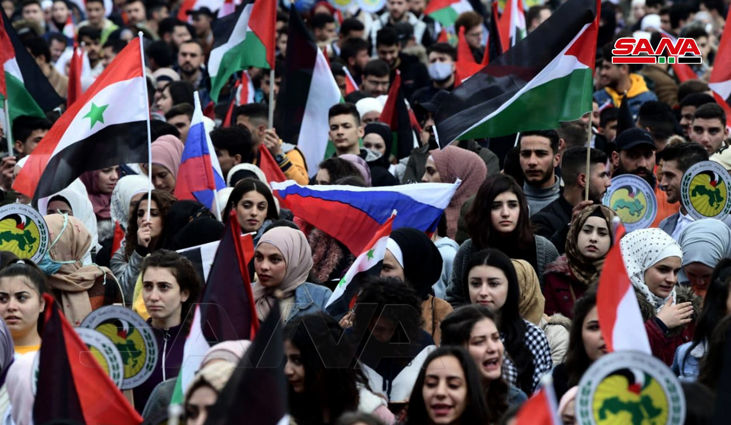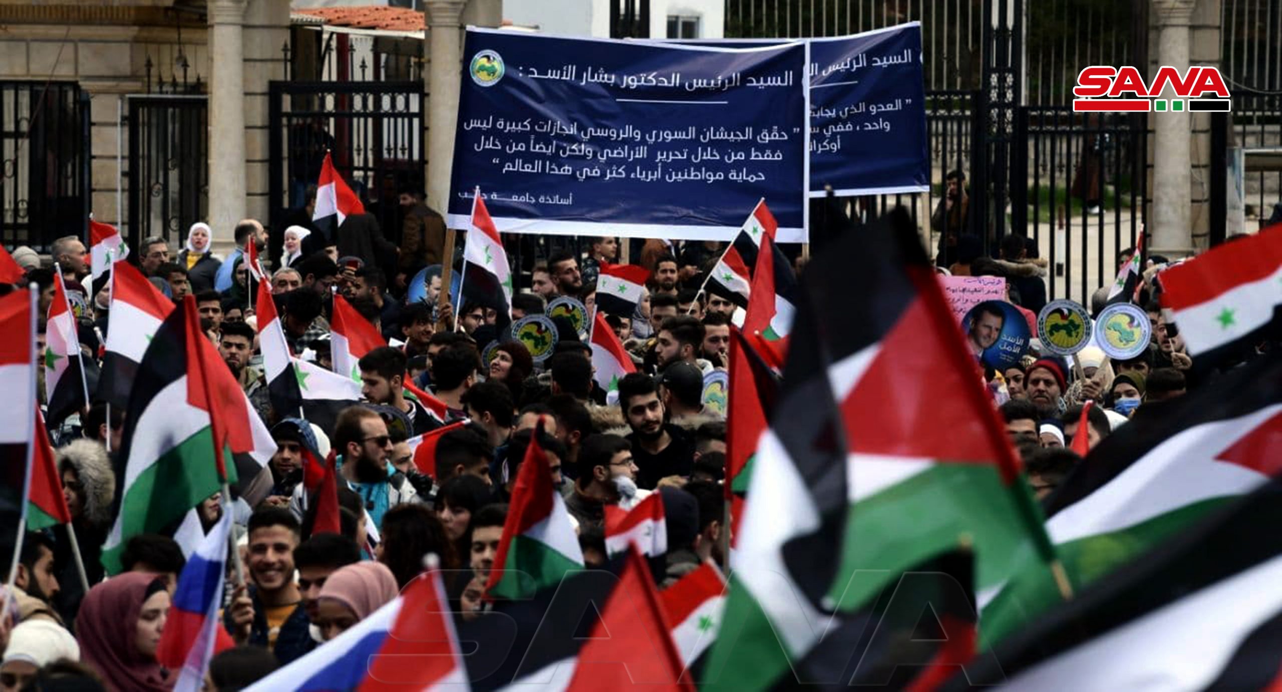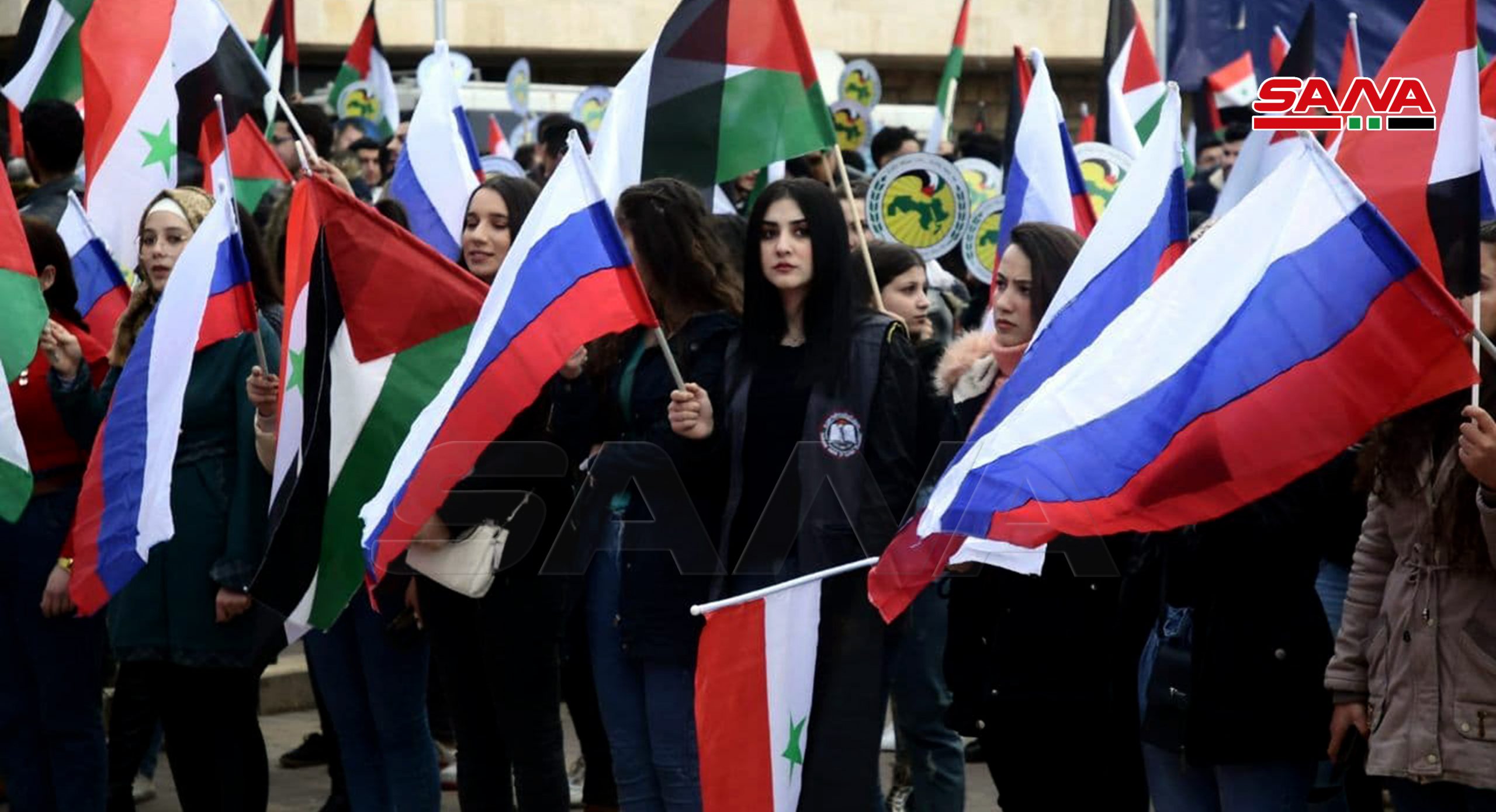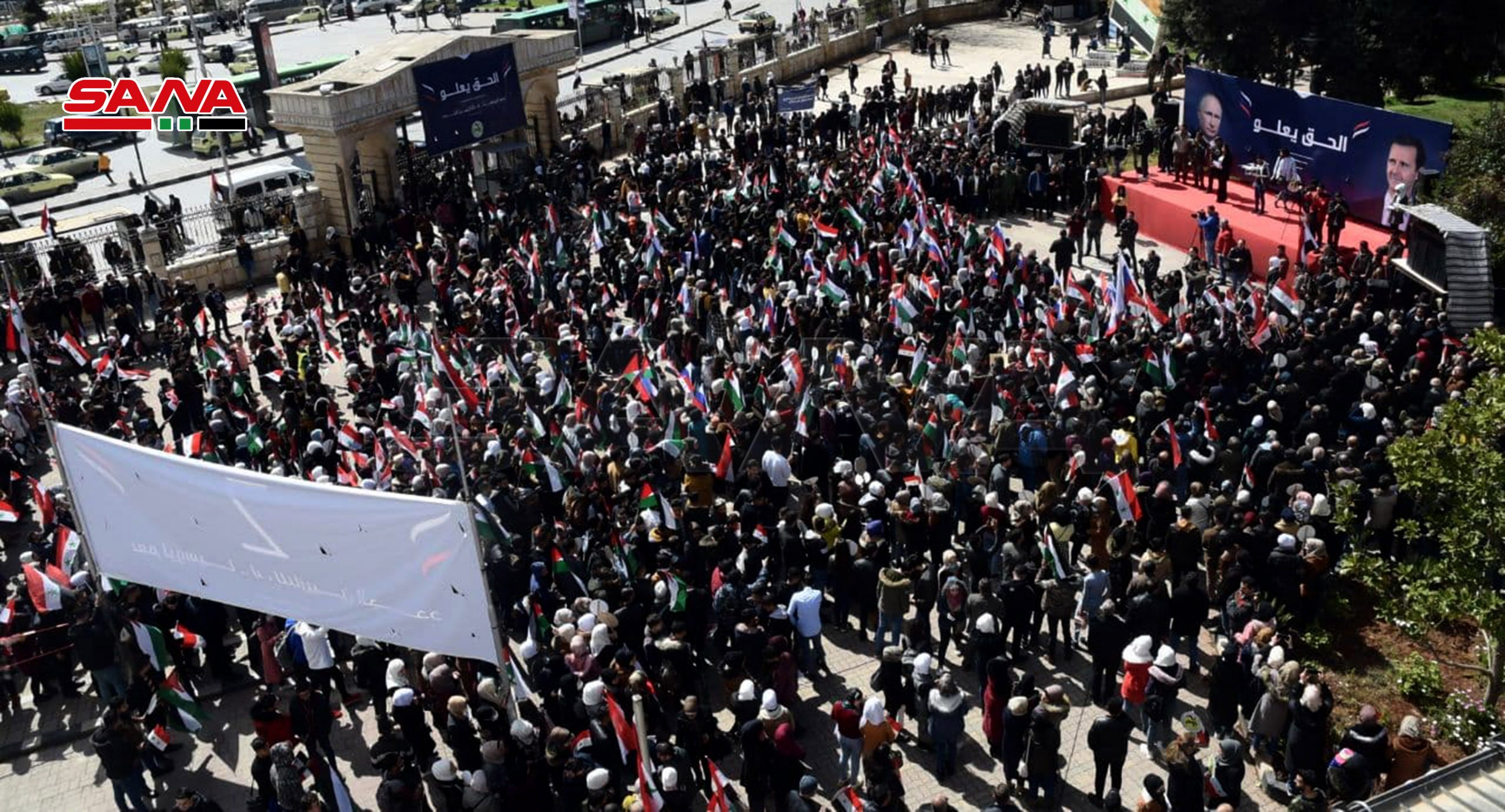Los representantes de la sucursal del Sindicato de Docentes, la sucursal de la Unión Nacional de Estudiantes Sirios y los comités sindicales y de trabajadores de la universidad pronunciaron discursos en los que afirmaron su plena posición y solidaridad con el pueblo y dirección política de Rusia en la defensa de su seguridad, responsabilizando a los Estados Unidos de América y sus aliados occidentales por las pérdidas que ocurren en Ucrania y en otras partes del mundo.