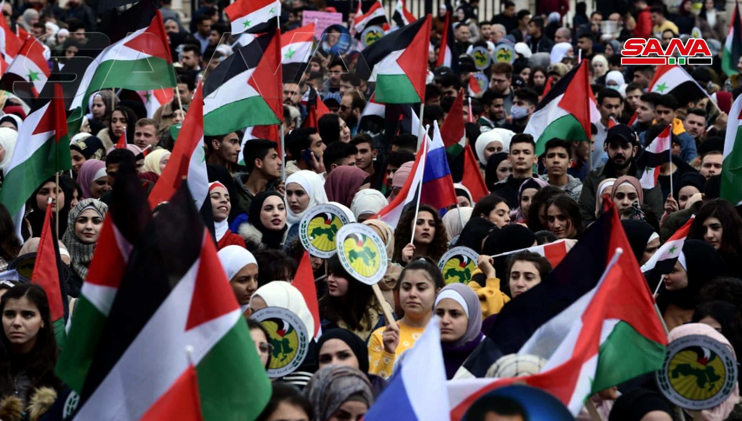 Los participantes izaron la bandera de la República Árabe Siria, la bandera de la Federación Rusa y pancartas que afirman el derecho legítimo de Rusia a proteger a los civiles en Donetsk y Luhansk frente a las prácticas de los ultranacionalistas en Ucrania que se vienen produciendo desde hace años.