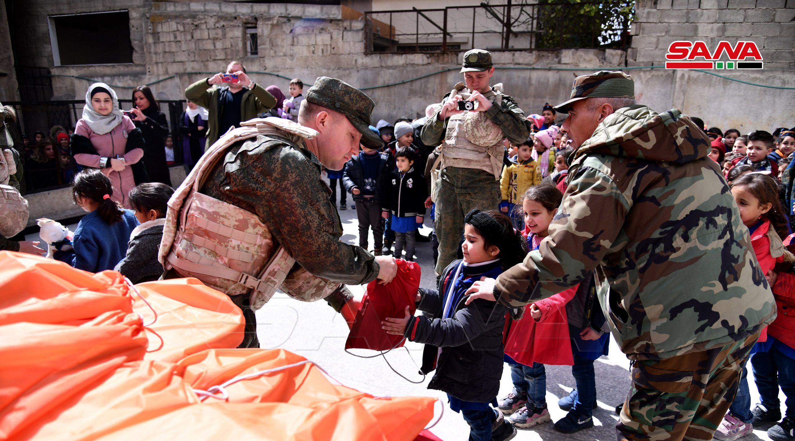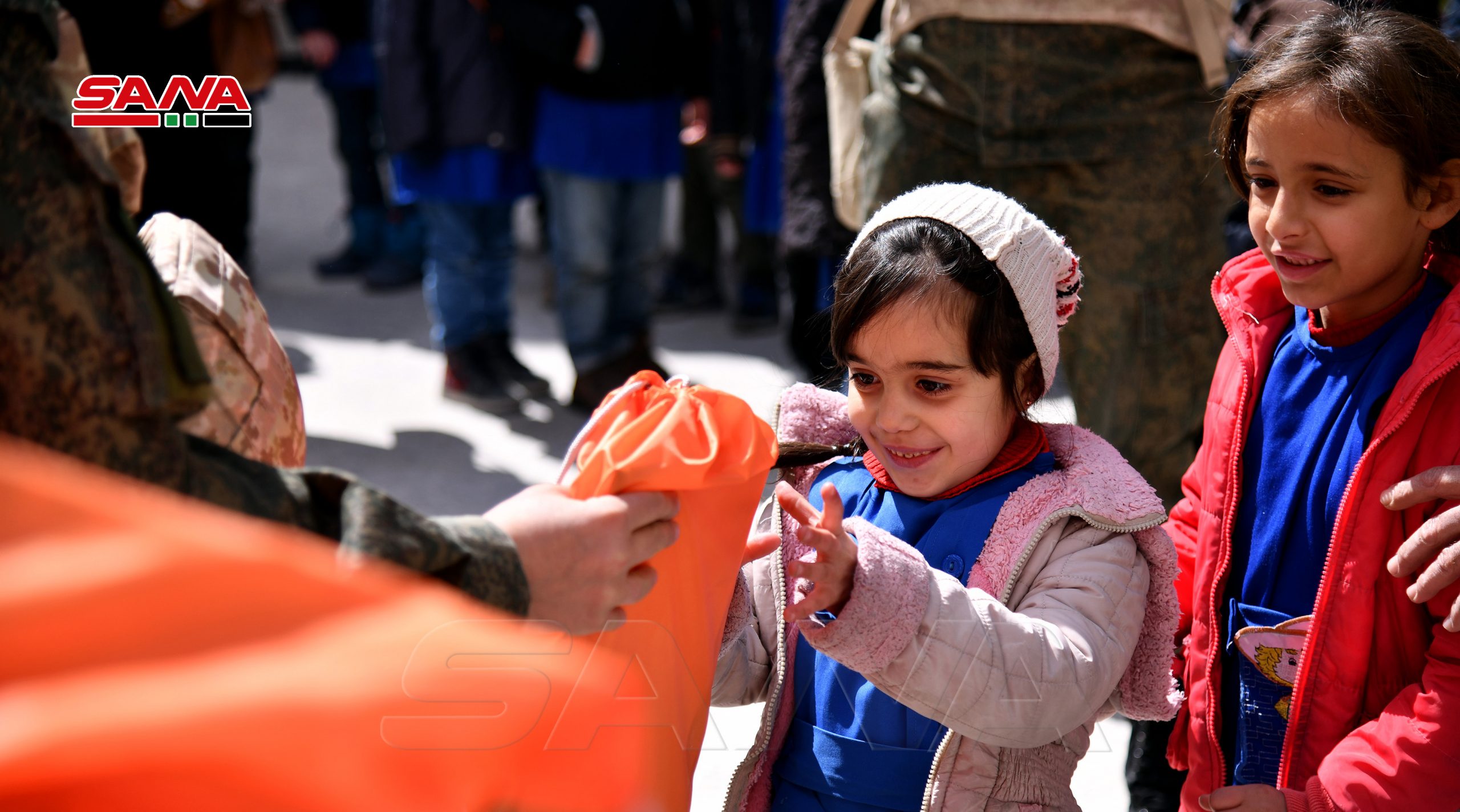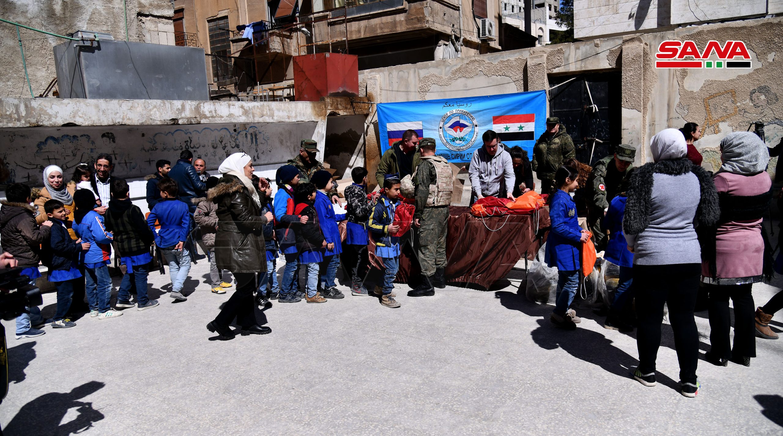 Damasco, 15 mar (SANA) El Centro de Coordinación de Rusia distribuyó este martes obsequios a los estudiantes en el barrio Barzeh en la capital Damasco.