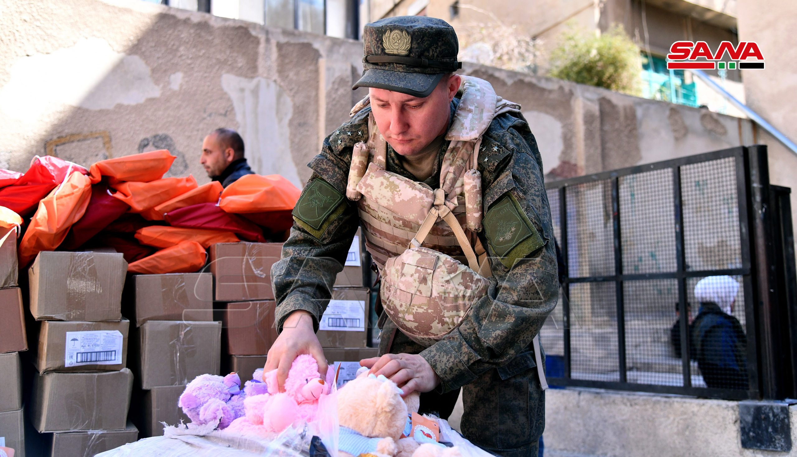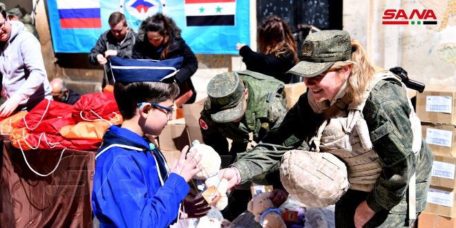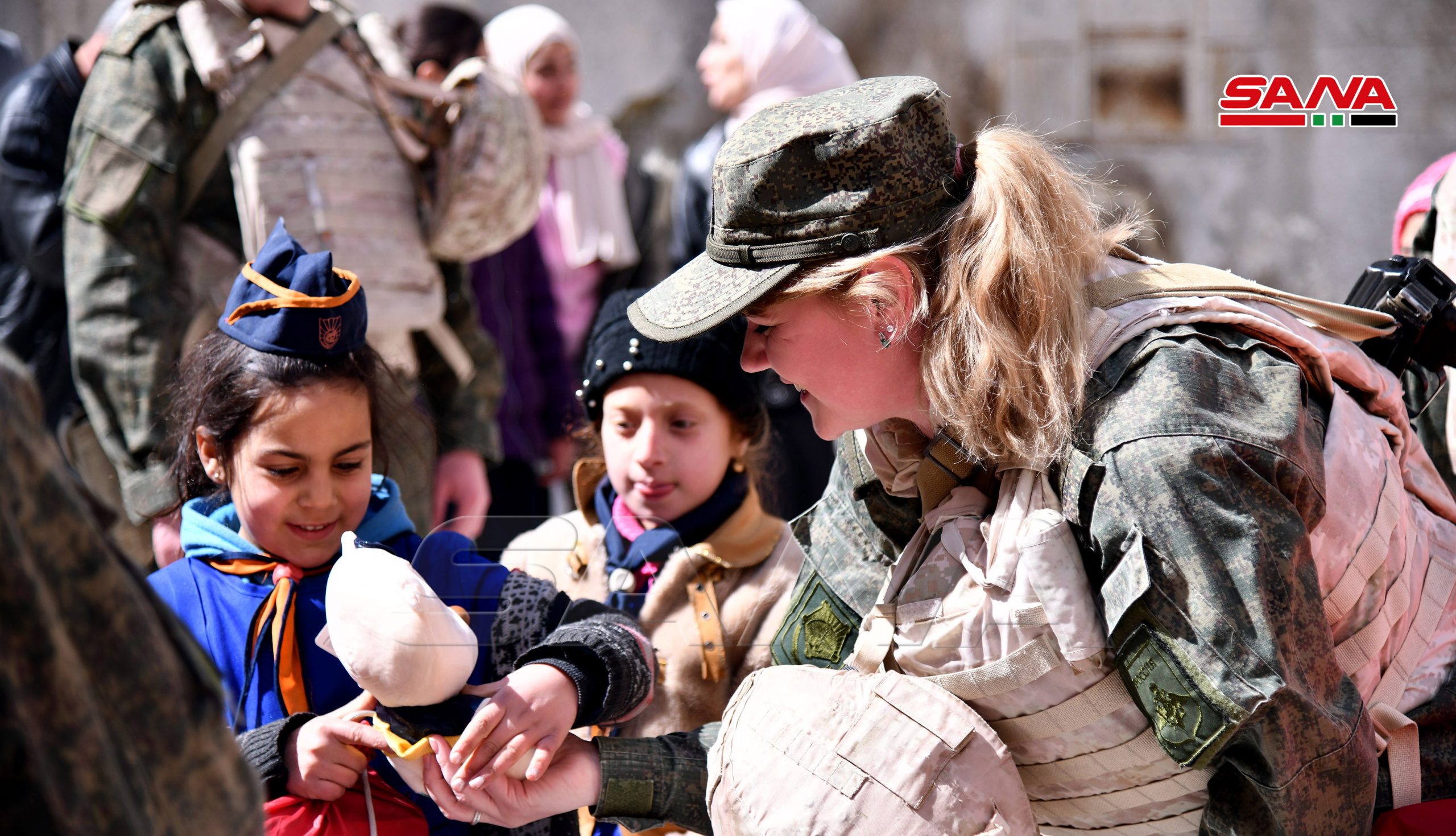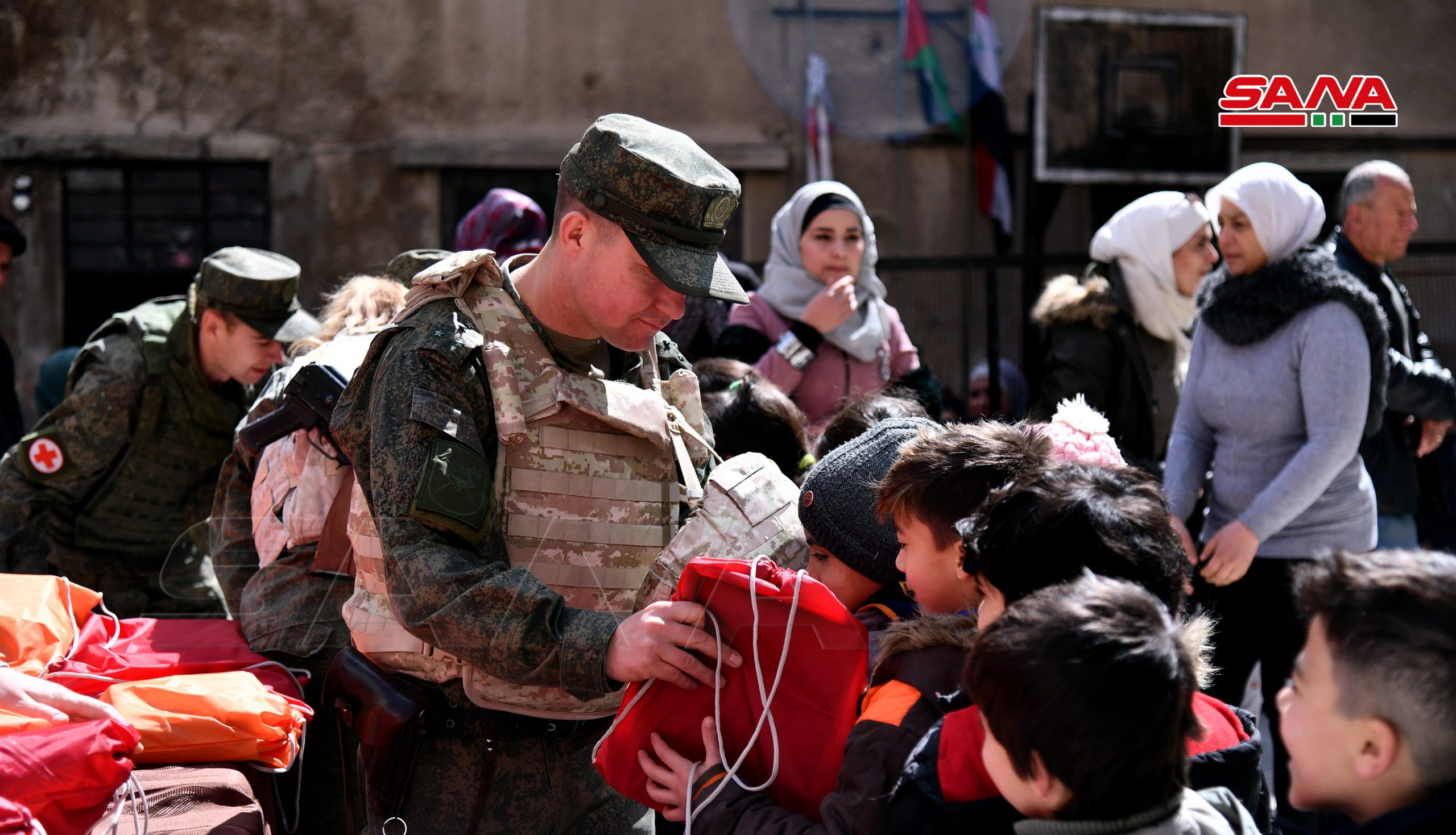 Damasco, 15 mar (SANA) El Centro de Coordinación de Rusia distribuyó este martes obsequios a los estudiantes en el barrio Barzeh en la capital Damasco.