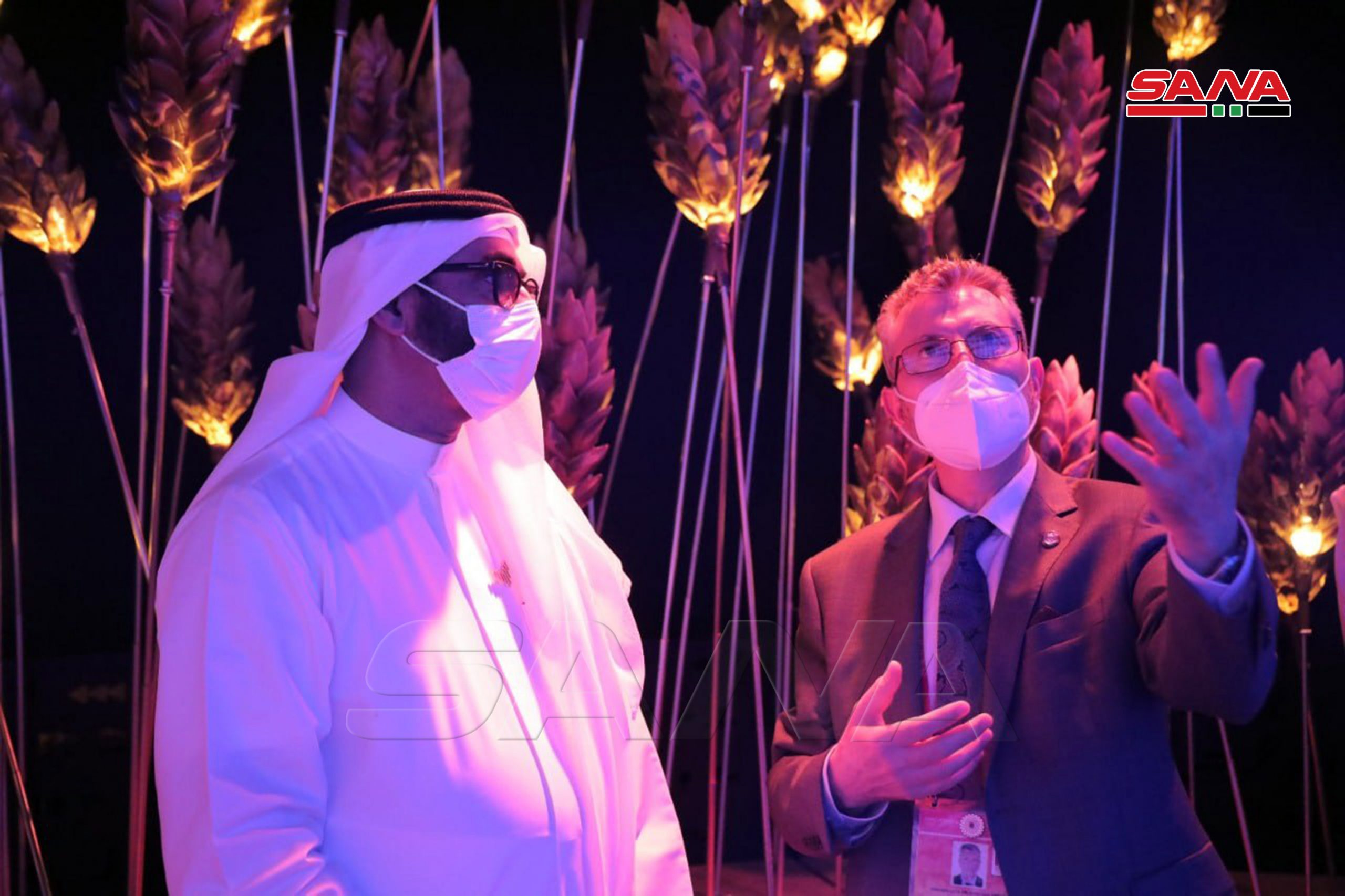Al final de la visita, el Embajador sirio y Comisionado General del pabellón, Ghassan Abbas, obsequió al Ministro emiratí con una copia del primer acuerdo de paz escrito en virtud del cual se puso fin a la guerra entre los hititas y los egipcios en suelo sirio, mientras que el ministro de los EAU entregó el escudo del ministerio a los funcionarios del pabellón de Siria.