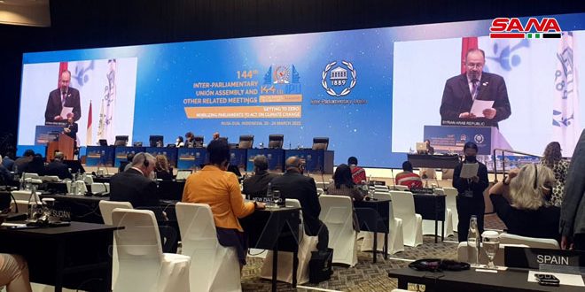Yakarta, 22 mar (SANA) La delegación del Parlamento sirio participó en la sesión de la Asamblea General de la Unión Interparlamentaria dedicada a discutir el tema de emergencia en la agenda, que fue presentado por Nueva Zelanda con el apoyo de los parlamentos de los países occidentales bajo el título “Solución pacífica a la guerra en Ucrania de conformidad con el Derecho Internacional”.