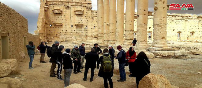 Palmira, 25 mar (SANA) Grupos de turistas extranjeros visitaron la histórica ciudad de Palmira para conocer de cerca su gran civilización y documentar la destrucción en sus monumentos arqueológicos a consecuencia de los ataques de los terroristas de organización “Daesh” antes de que fueran expulsados de la misma en 2016 a manos del ejército sirio.