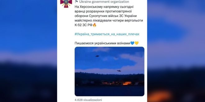“En dirección a Jersón, unidades de la defensa antiaérea de las Fuerzas Terrestres de las Fuerzas Armadas de Ucrania eliminaron magistralmente cuatro helicópteros K-52 de las Fuerzas Armadas de la Federación Rusa”, escribió el Ministerio en su cuenta en Twitter.