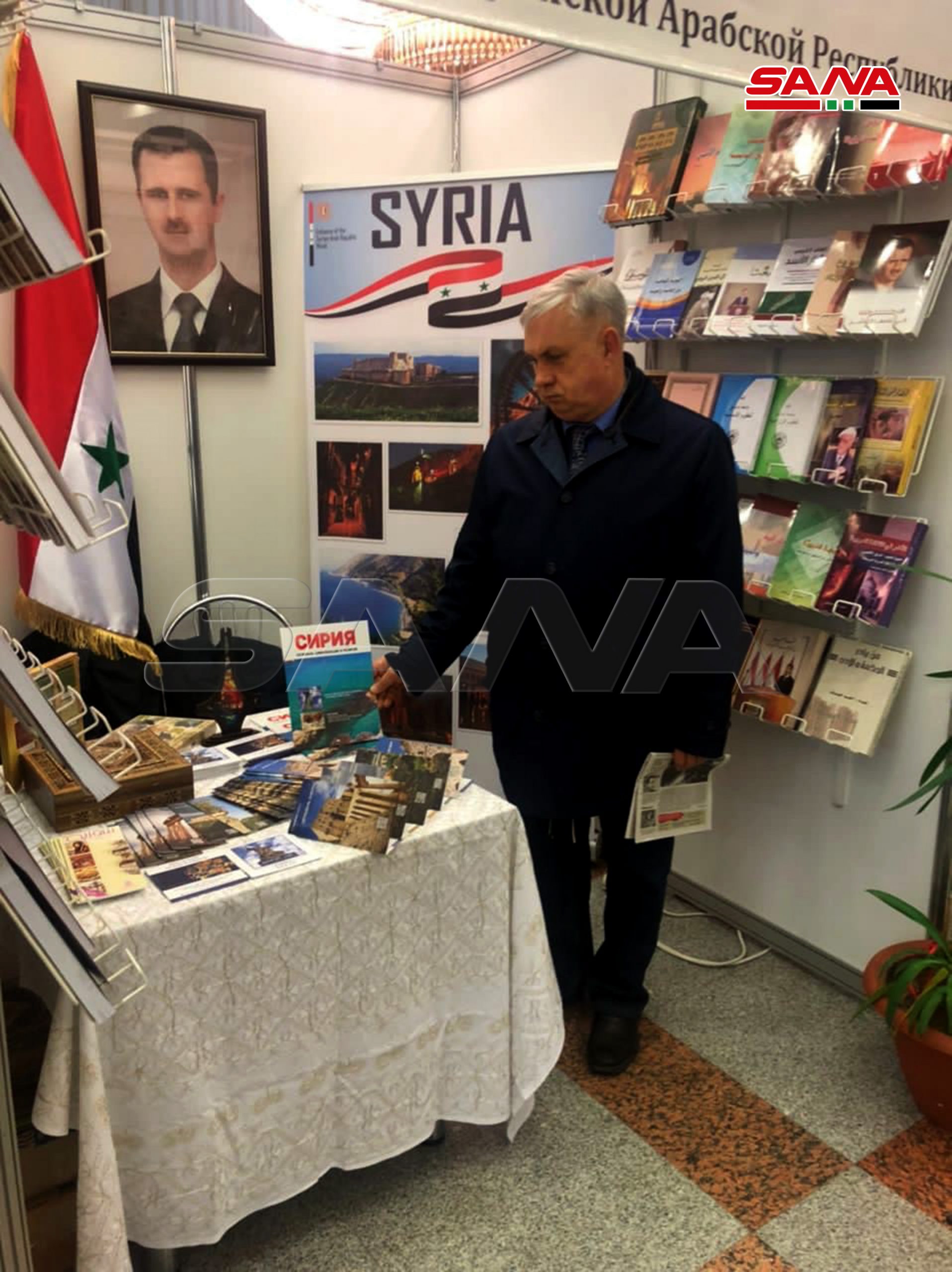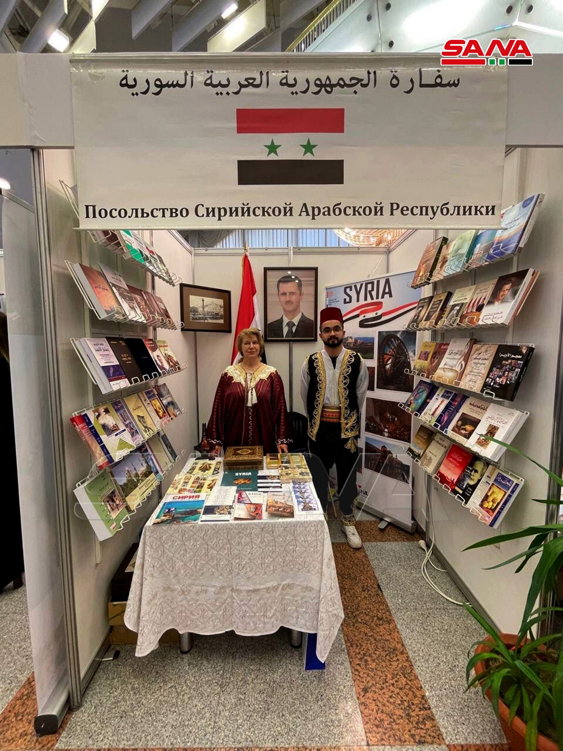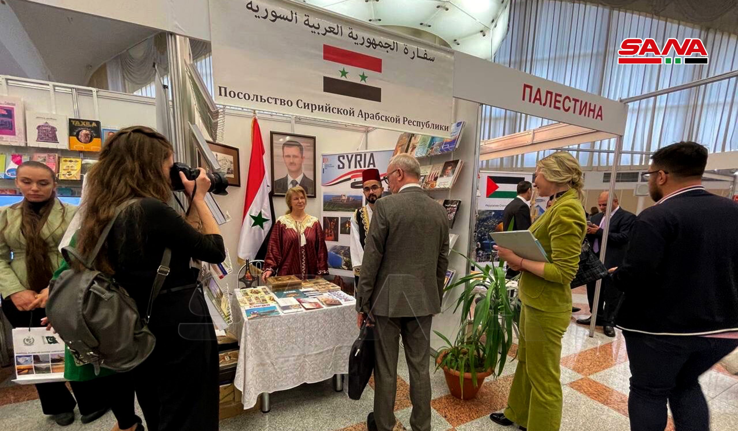 El Pabellón de Siria en la exposición de este año, organizada por la Embajada de Siria en Minsk con la participación de la Unión Nacional de Estudiantes Sirios en Bielorrusia, incluyó un conjunto de libros, publicaciones y folletos sobre cultura y turismo en árabe y ruso, así como una colección de pinturas, fotografías, artesanías y trajes nacionales que reflejan la historia y la civilización de Siria.