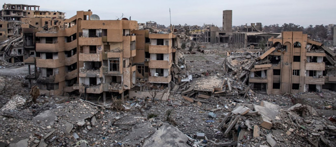 De acuerdo con el Instituto de las Naciones Unidas para Capacitación e Investigación, cerca de 11.000 edificios en la ciudad fueron completamente destruidos o sufrieron grandes daños entre febrero y octubre de 2017, equivalente a la destrucción de 40 edificios por día.