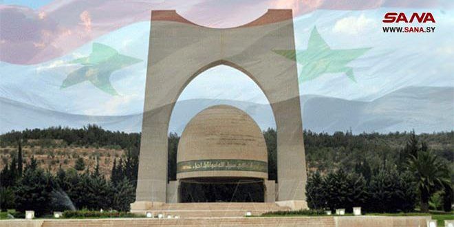 La cúpula se eleva 28,5 m y se apoya sobre dos soportes a ambos lados; su diámetro es de 20 m, y en su borde exterior brilla un cinturón de mosaico verde de 2m de ancho donde se lee la siguiente inscripción hecha en mosaico vidrioso dorado: (En el nombre de Al-Lah el Compasivo el Misericordioso: Y no penséis que quienes han caído por Al-Lah hayan muerto. ¡Al contrario! Están vivos y sustentados junto a su Señor.). Frente al monumento se sitúa una antorcha de 2m de diámetro y 0.7 m de altura; es rodeada de un marco de mármol donde se lee: (Aquí yace un combatiente que murió por Siria y la arabidad)