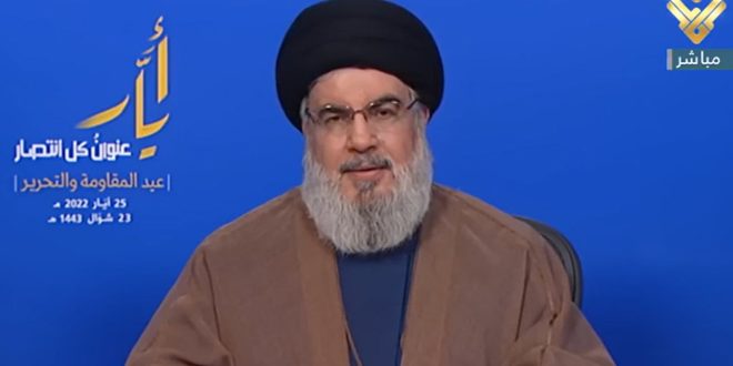Sayyed Nasrallah dijo en un discurso televisado con motivo del Día de la Resistencia y la Liberación que la resistencia protege al Líbano y obliga al enemigo a tener cuidado, y que la resistencia no necesita el permiso de nadie para cumplir con su deber.