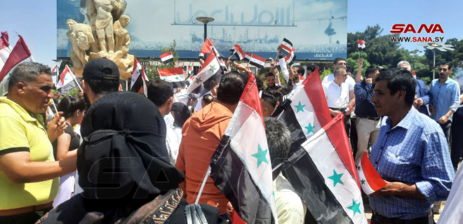 Alepo, 28 may (SANA) Una masiva manifestación tuvo lugar hoy en la central y emblemática plaza de Sadalla Al-Yabri en la ciudad de Alepo en rechazo a la ocupación turca y condena a sus repetidas agresiones contra las zonas residenciales y sus planes expansionistas en el norte de Siria.