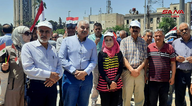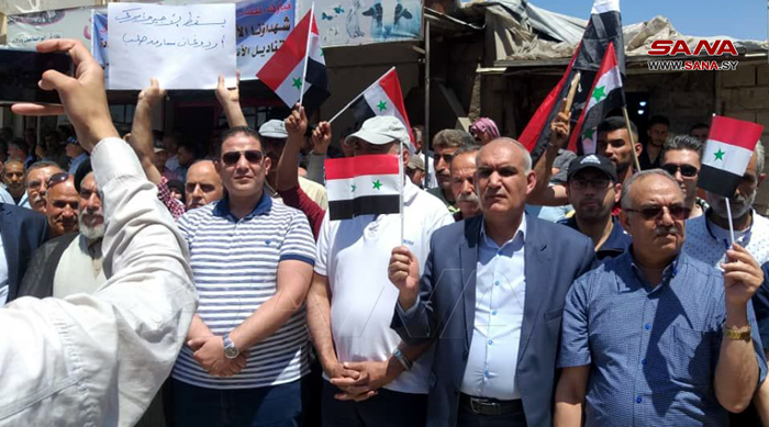 Los manifestantes denunciaron los crímenes turcos contra los ciudadanos sirios y exigieron la salida de los militares de Ankara y de sus mercenarios terroristas del territorio nacional.