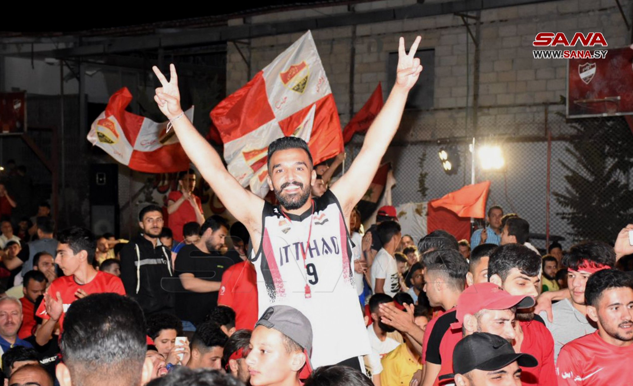 14/06/2022 Alepo,14 jun (SANA) La alegría de los aficionados del Ittihad Ahli de Alepo por la victoria de su equipo contra al-Karama en la Liga Nacional de Baloncesto???? 2022-06-14 lluvia