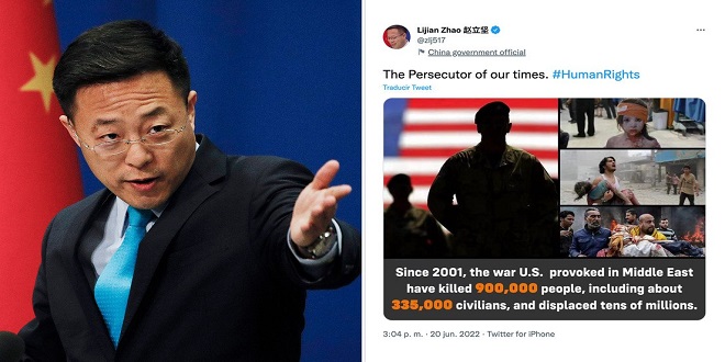 Pekín, 21 jun (SANA) El portavoz del Ministerio de Exteriores de China, Zhao Lijian, publicó en su cuenta de Twitter una imagen de los militares estadounidenses junto a las de las víctimas de los conflictos en Oriente Medio, publicó RT hoy .