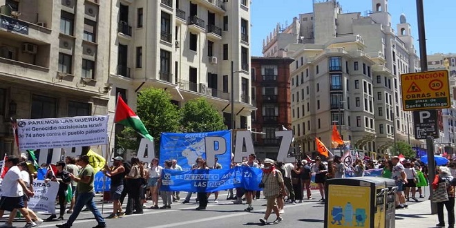 La víspera, miles de personas marcharon por el centro de Madrid en favor de la paz y en rechazo a la OTAN, en particular al encuentro que se efectuará aquí.