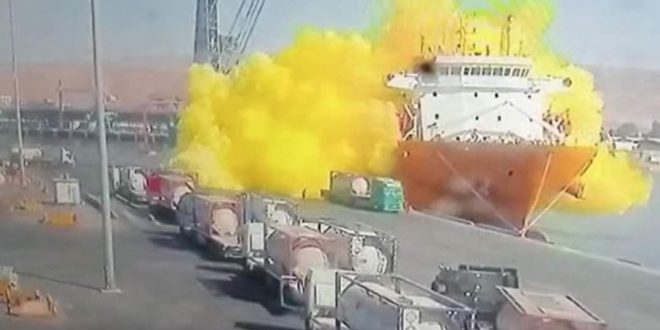 Según los videos publicados, el tanque cargado con gas venenoso cayó cuando se intentó transportarlo desde un barco, lo que requirió la evacuación de la costa sur del puerto de Aqaba.