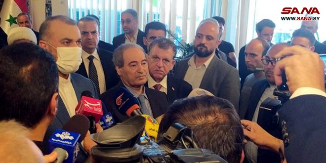 Damasco, 02 jul (SANA) El ministro de Exteriores y Expatriados, Faisal Mikdad, recibió este sábado en el Aeropuerto Internacional de Damasco a su homólogo iraní, Hossein Amir-Abdollahian, quien comenzó una visita oficial a Siria.