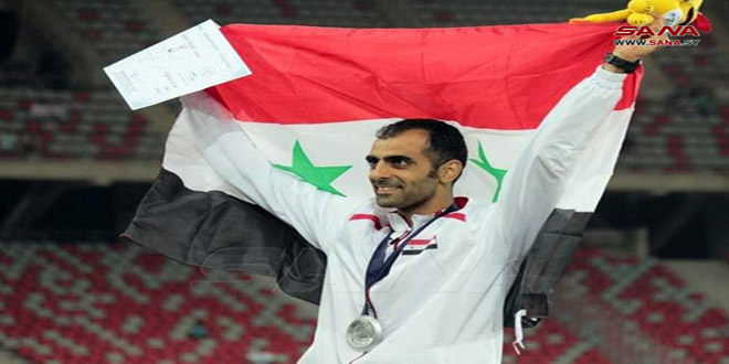 El sirio Majd al-Din Ghazal alegre con su medalla de plataen Salto de Altura en los Juegos del Mediterráneo en Orán, Argel.