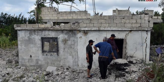 03/07/2022 Tartous, 3 jul (SANA) Campesinos sirios chequean los daños que sufrió su casa por el ataque israelí con misiles perpetrado el sábado, 2 de julio 2022, contra la localidad de Hamidieh al sur de la provincia costera siria de Tartous. 2022-07-03 reem
