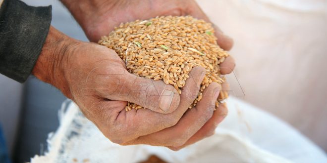 Agricultores sirios cosechan sus tierras sembradas de trigo ???? en la provincia siria de Swieda.