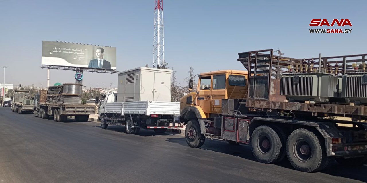 Alepo, 23 jul (SANA) Dos convoyes de camiones cargados con equipos para mejorar el servicio eléctrico se dirigieron hoy a Alepo para apoyar el sector eléctrico en esta provincia norteña.