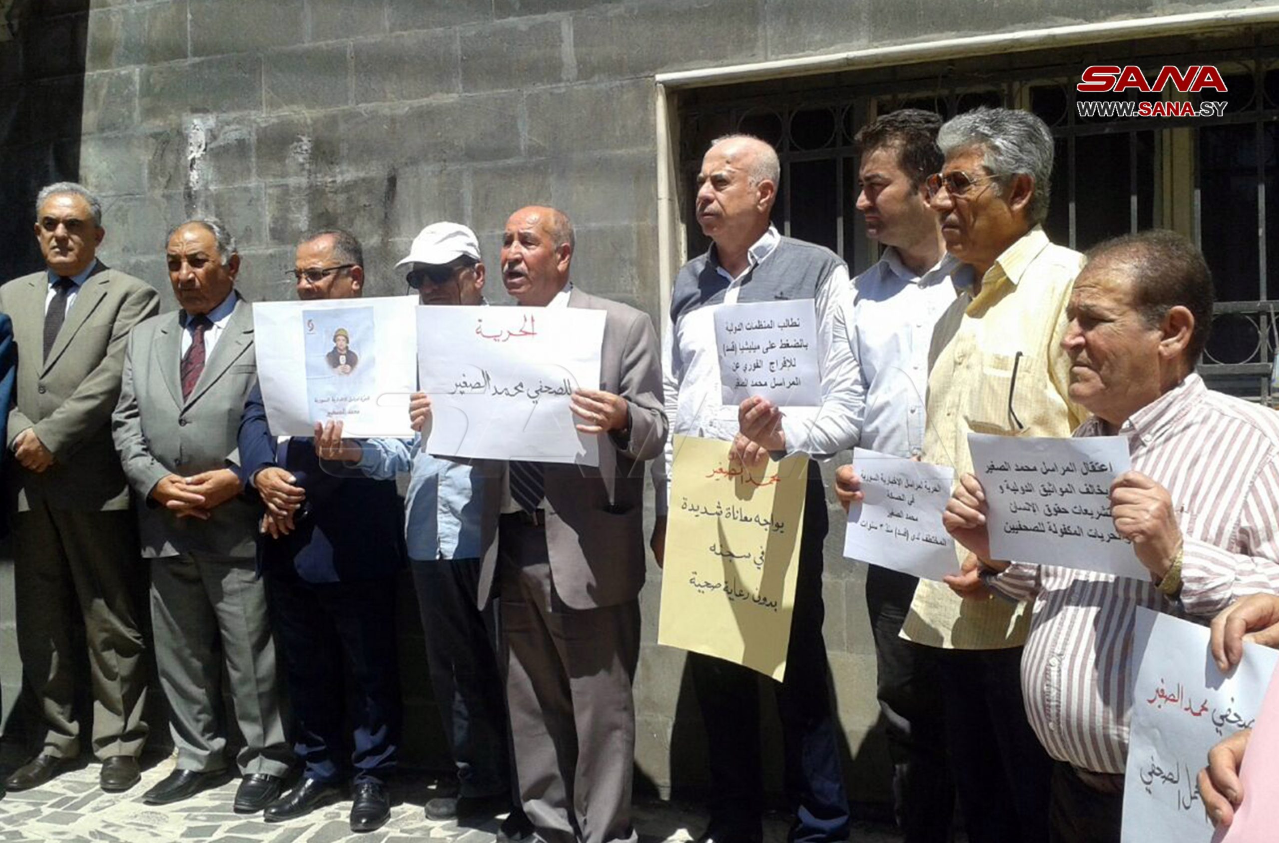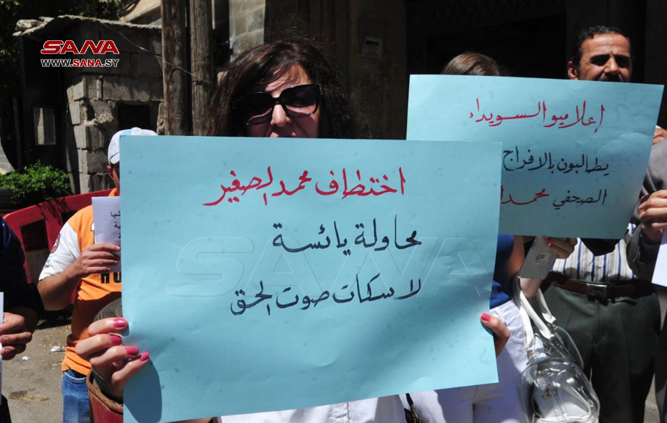 Sweida, 24 jul (SANA) Los periodistas de la provincia de Sweida realizaron una sentada este domingo frente a la sede de la Unión de Periodistas en la Región Sur para exigir la liberación inmediata del corresponsal de la televisión siria Ikhbariya, Muhammad Al- Saghir.