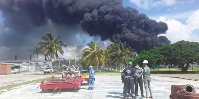 Fuerzas especializadas de la isla, en coordinación con similares de México y Venezuela, laboran ininterrumpidamente para sofocar el fuego, que se extendió a un segundo tanque provocando una fuerte explosión y amenaza con extenderse a otras zonas.